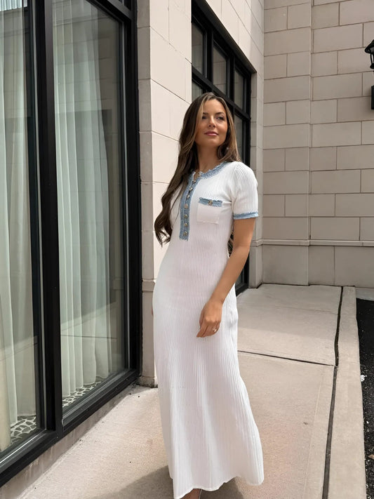 Élodie – Elegancka dzianinowa sukienka maxi z kontrastowym wykończeniem