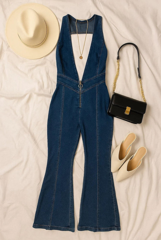 🖤 Élodie – Kombinezon dżinsowy z głębokim dekoltem i zamkiem błyskawicznym