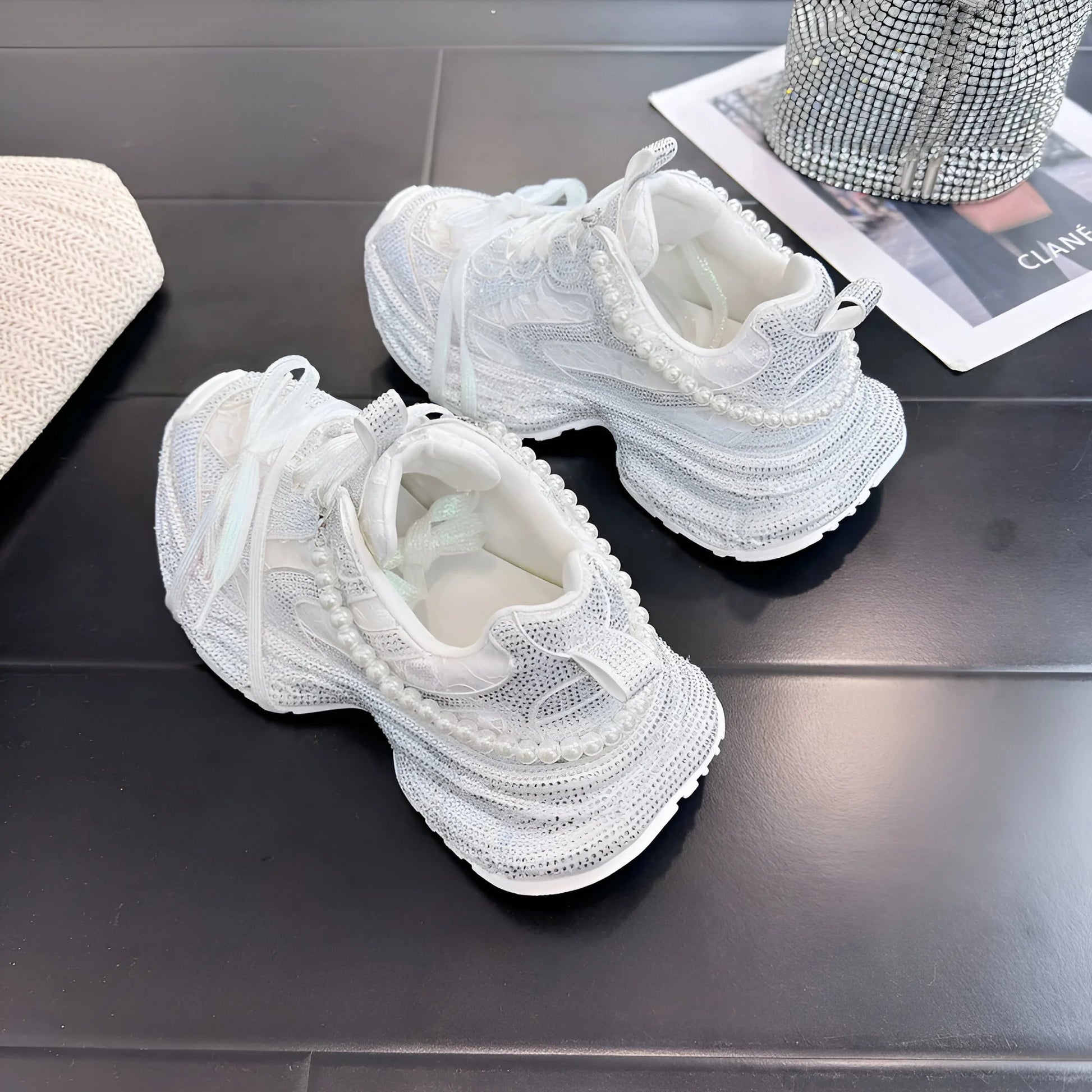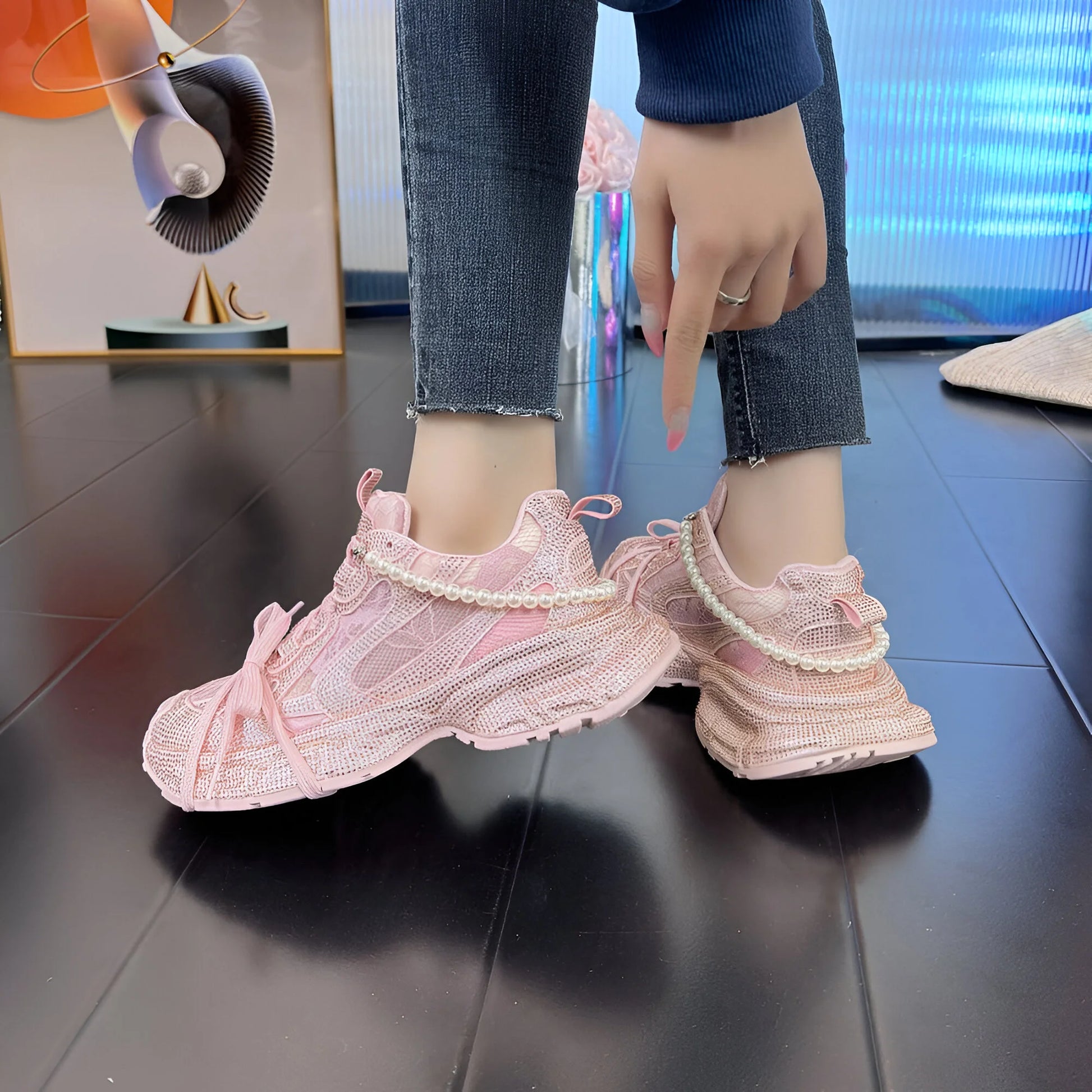 Zaprojektowane z myślą o stylu i wydajności, te trampki mają przewiewną cholewkę z siateczki ozdobioną kryształowymi detalami dla uderzającego wyglądu. Gruba amortyzowana podeszwa zapewnia wsparcie, dzięki czemu idealnie nadają się do biegania, codziennych wyjść lub całodziennego noszenia.