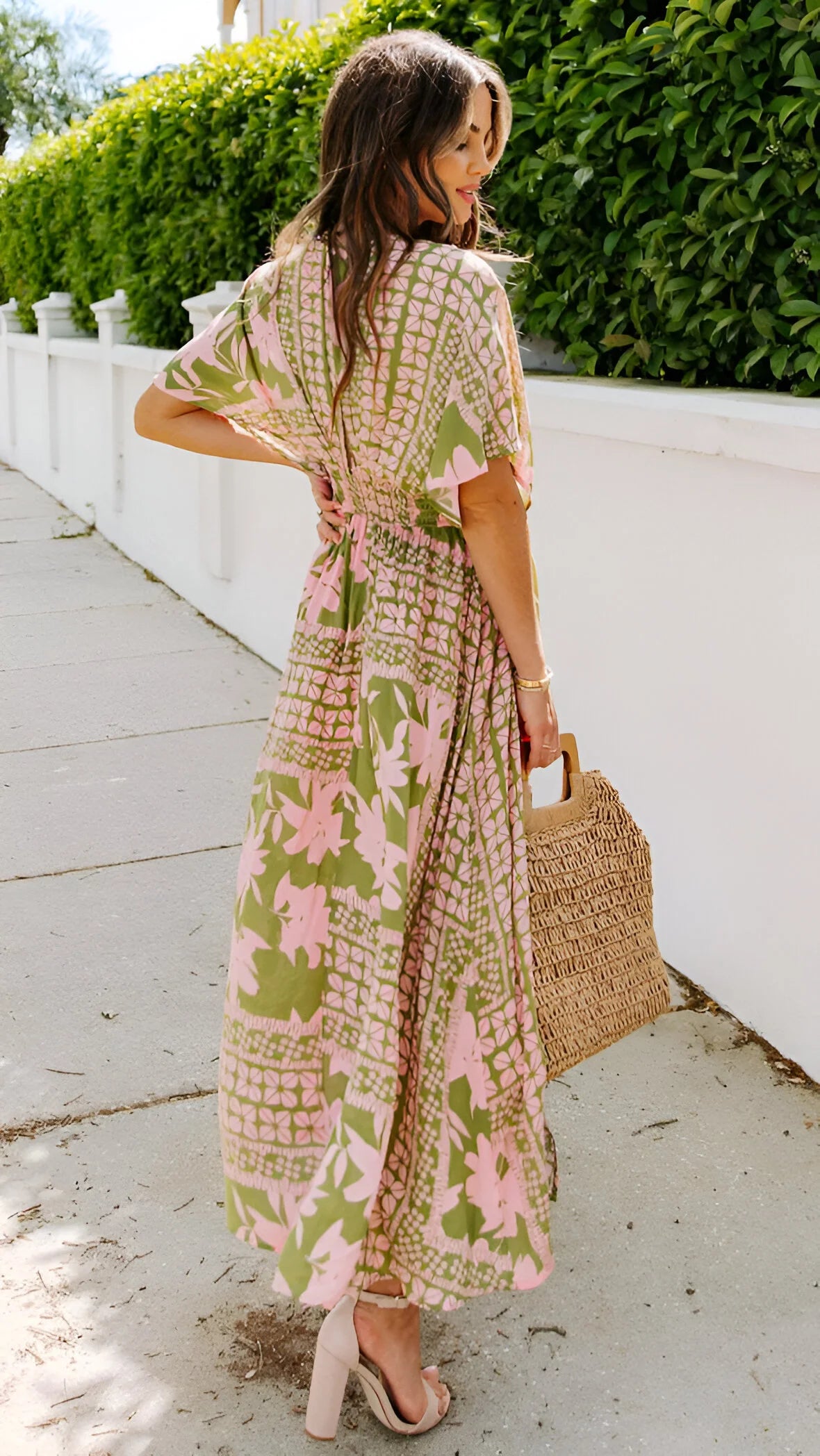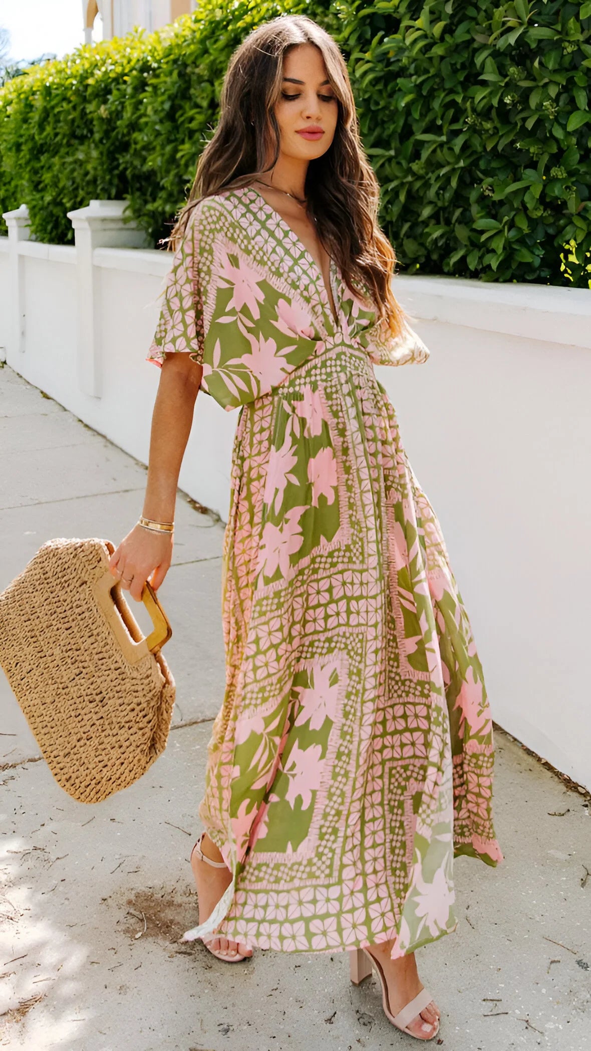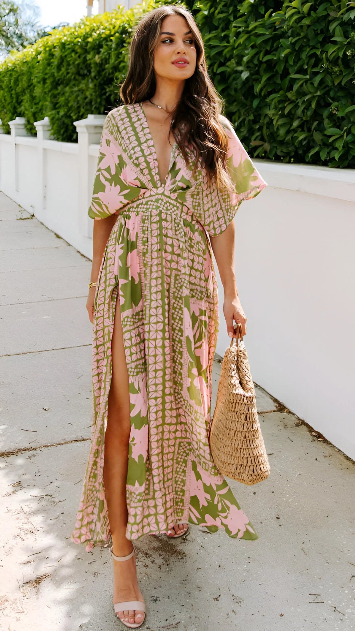 Wkrocz w elegancję bez wysiłku z tą zwiewną sukienką maxi w stylu boho, zaprojektowaną z głębokim dekoltem w serek i pochlebnym wysokim stanem. Idealna na wakacje, dni na plaży lub stylowe letnie wyjścia.