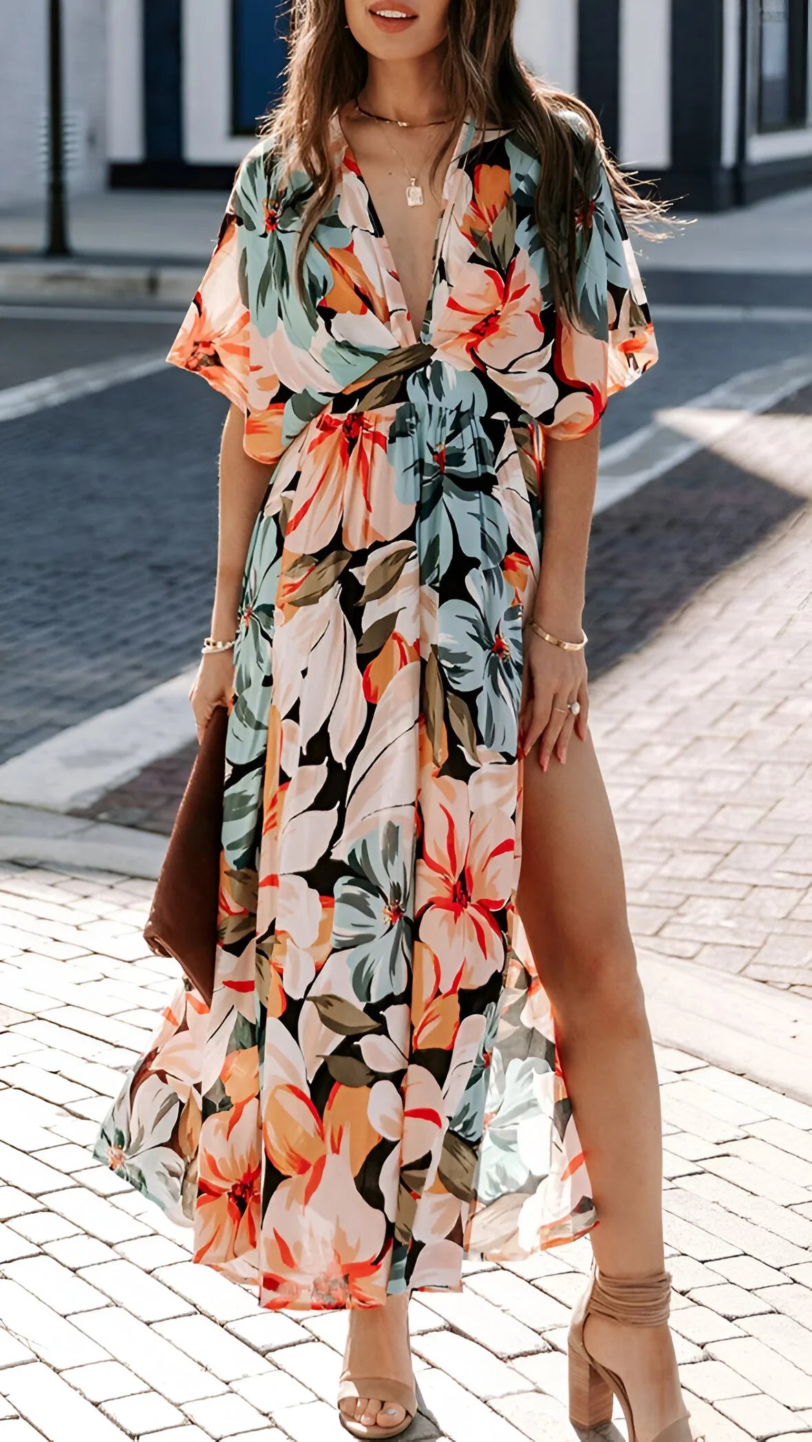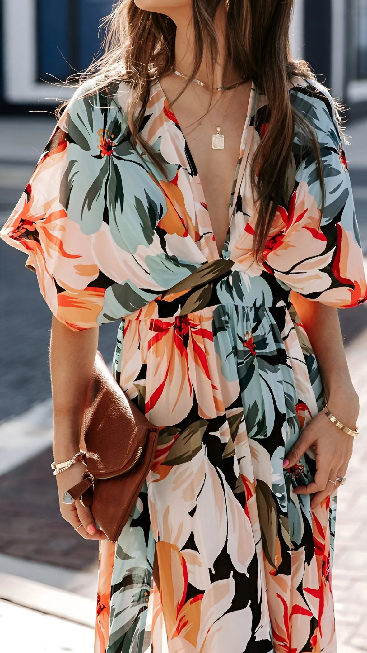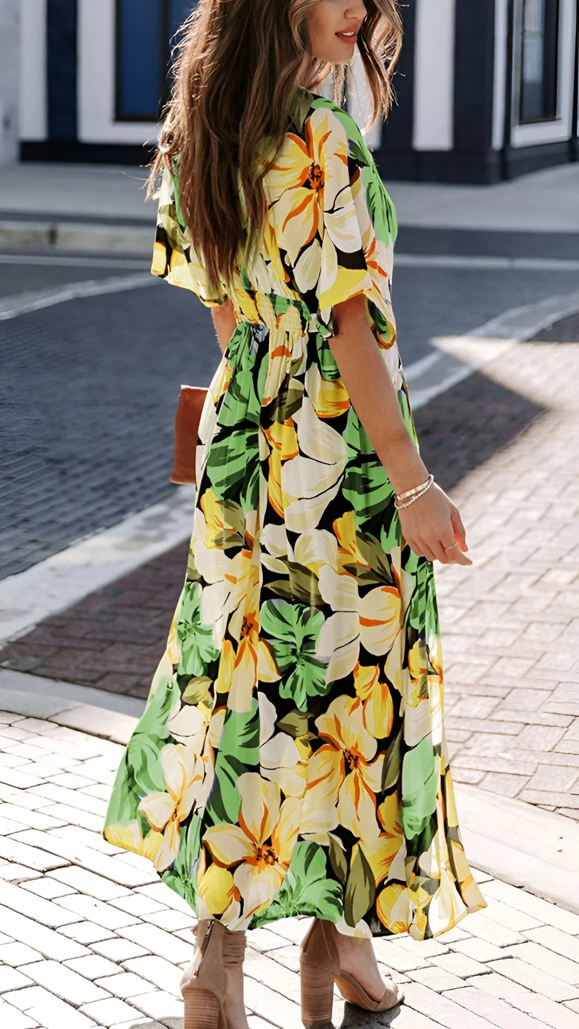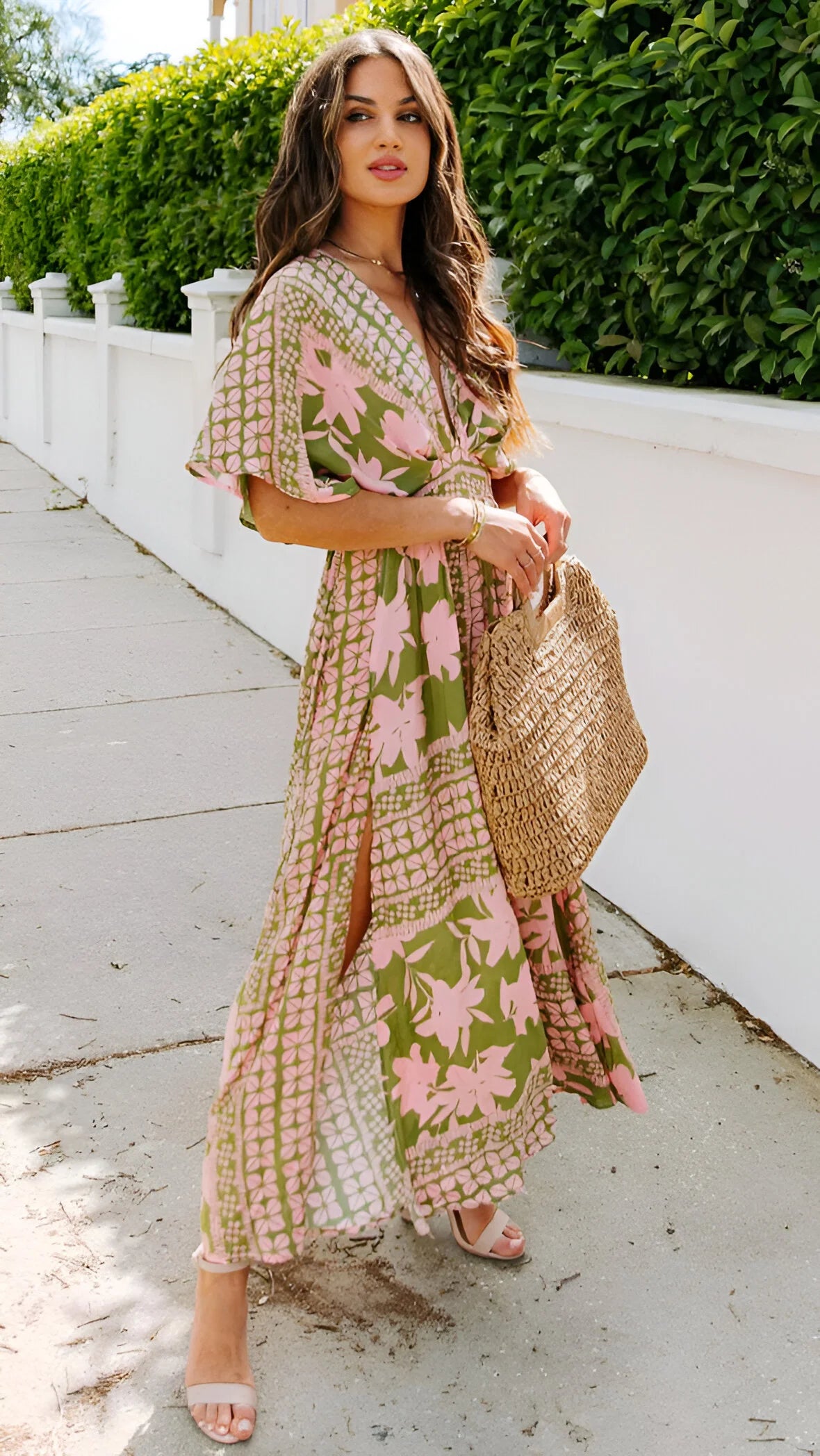 Wkrocz w elegancję bez wysiłku z tą zwiewną sukienką maxi w stylu boho, zaprojektowaną z głębokim dekoltem w serek i pochlebnym wysokim stanem. Idealna na wakacje, dni na plaży lub stylowe letnie wyjścia.
