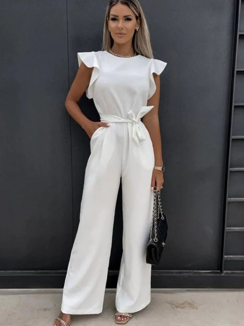 Wkrocz w wyrafinowanie z naszym eleganckim białym kombinezonem damskim z rękawami motylkowymi. Ten solidny, swobodny kombinezon z okrągłym dekoltem ma szerokie nogawki i pochlebny pasek, dzięki czemu idealnie nadaje się na lato i do biura. Rękawy motylkowe dodają odrobinę kobiecości i elegancji.