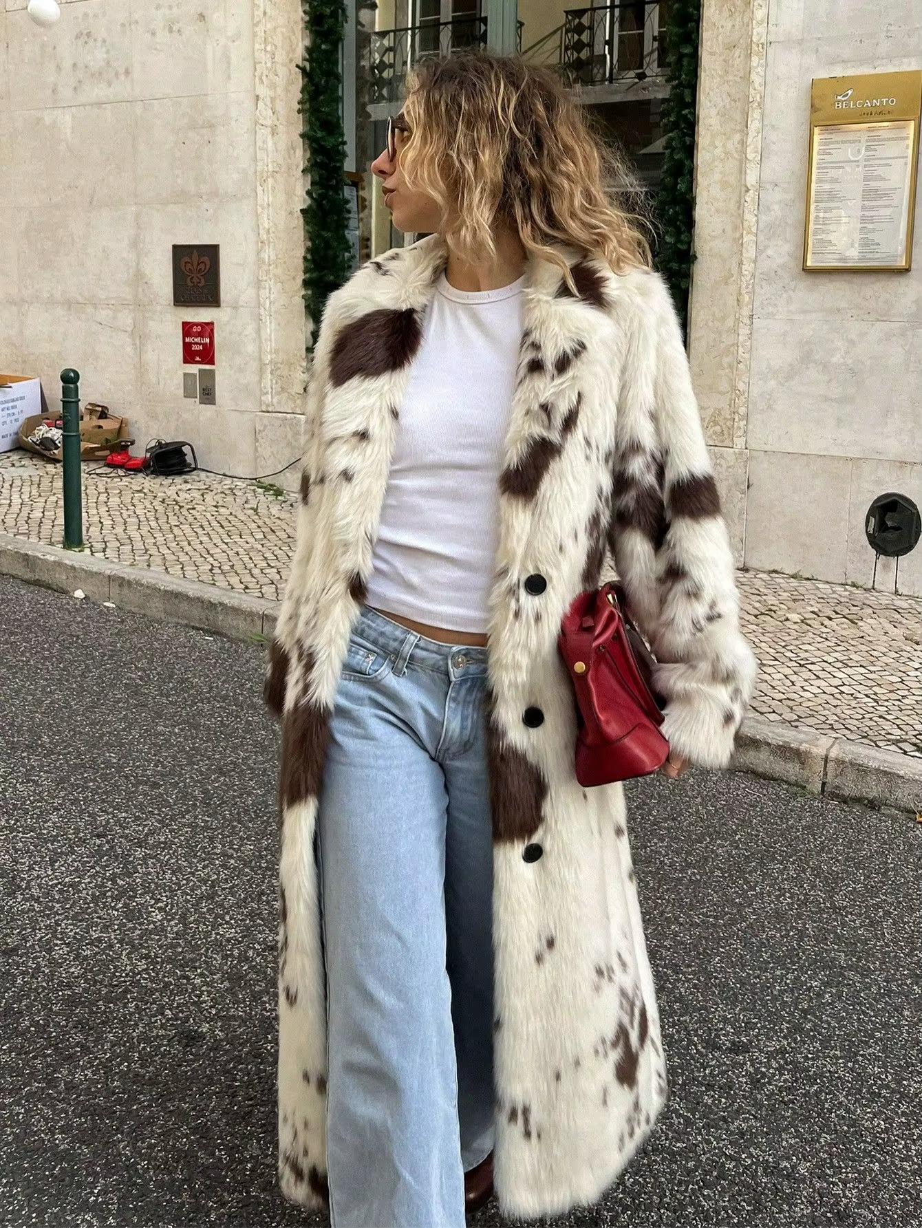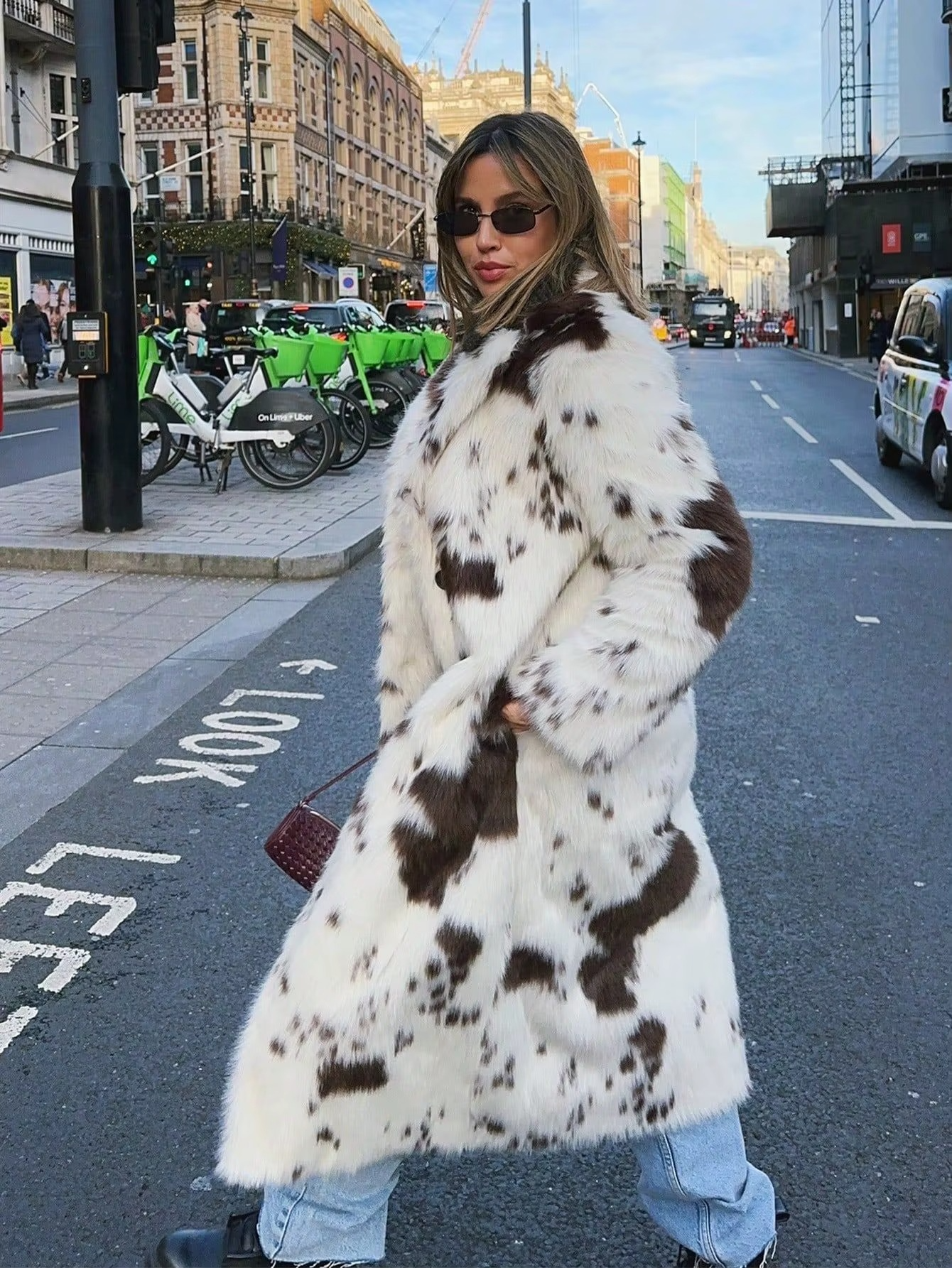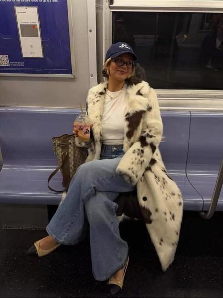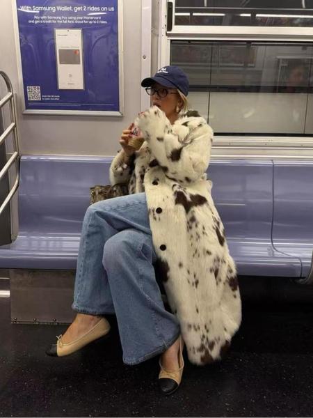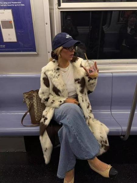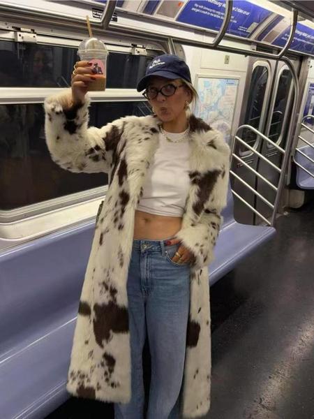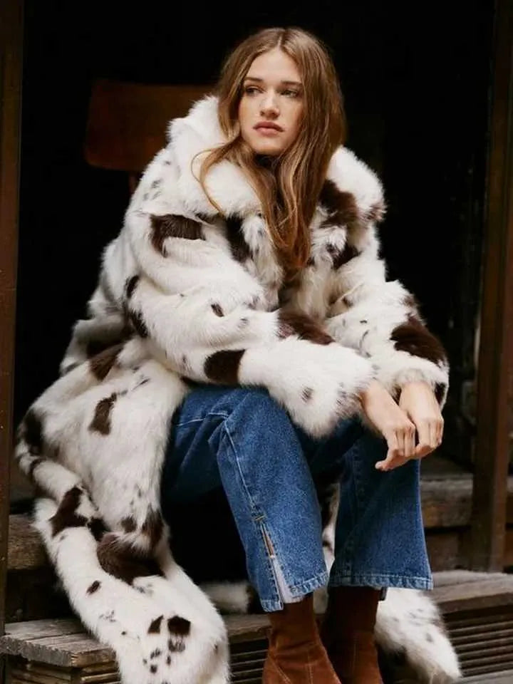 Aura - Gruby, ciepły płaszcz futrzany z nadrukiem krowim