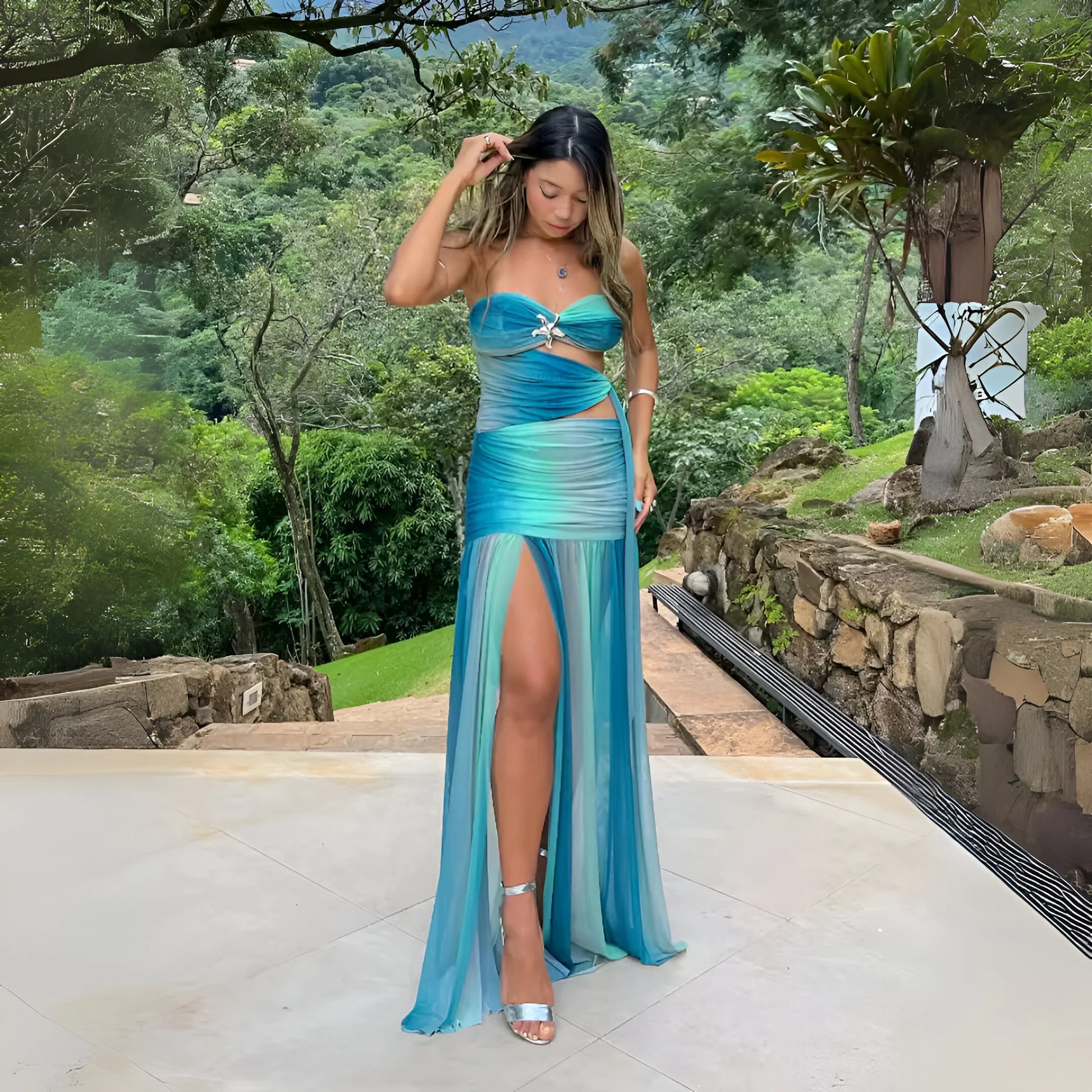 Aurélie to zapierająca dech w piersiach mieszanka artyzmu i uroku, dostępna w dwóch hipnotyzujących odcieniach. Z dekoltem bandeau, rzeźbionym drapowaniem i odważnym wysokim rozcięciem, ta sukienka jest stworzona, aby poruszać się z elegancją i przyciągać uwagę od zmierzchu do świtu.
