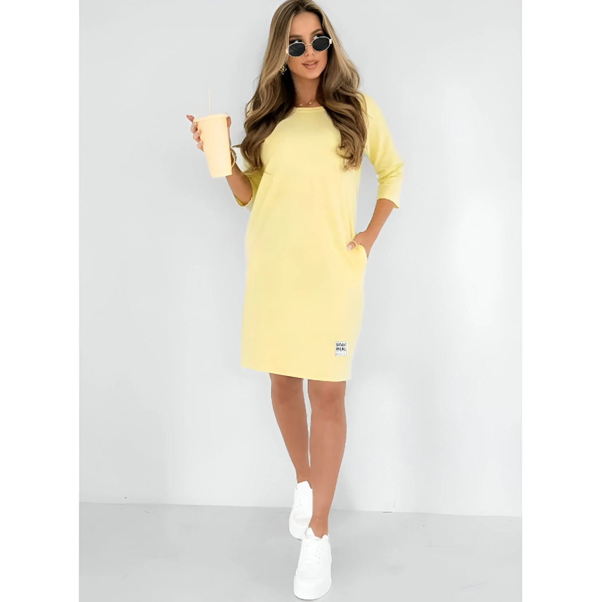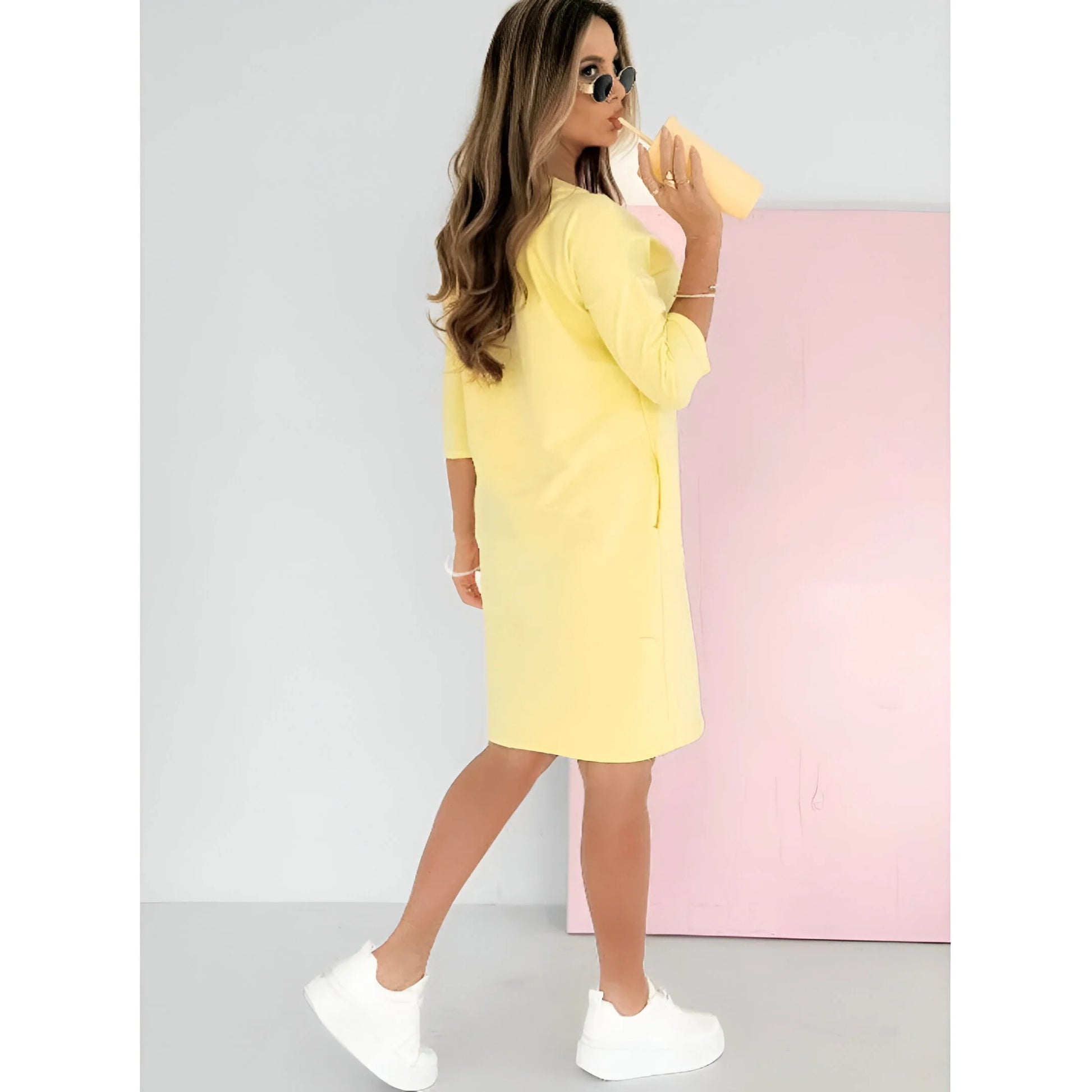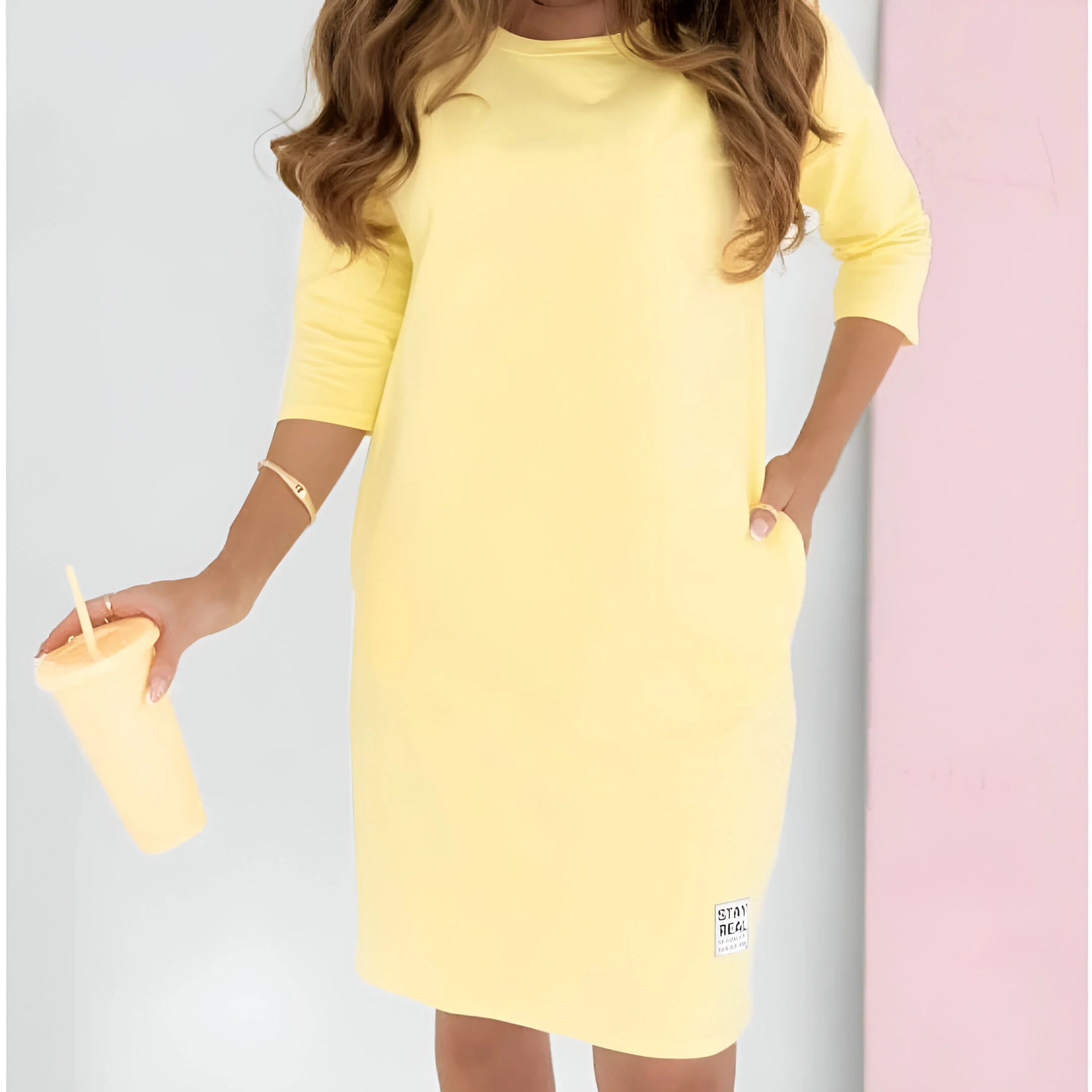 Pozostań stylowa bez wysiłku dzięki tej wygodnej sukience z klasycznym okrągłym dekoltem i praktycznymi kieszeniami. Rękawy 3/4 sprawiają, że jest idealna do noszenia na co dzień.