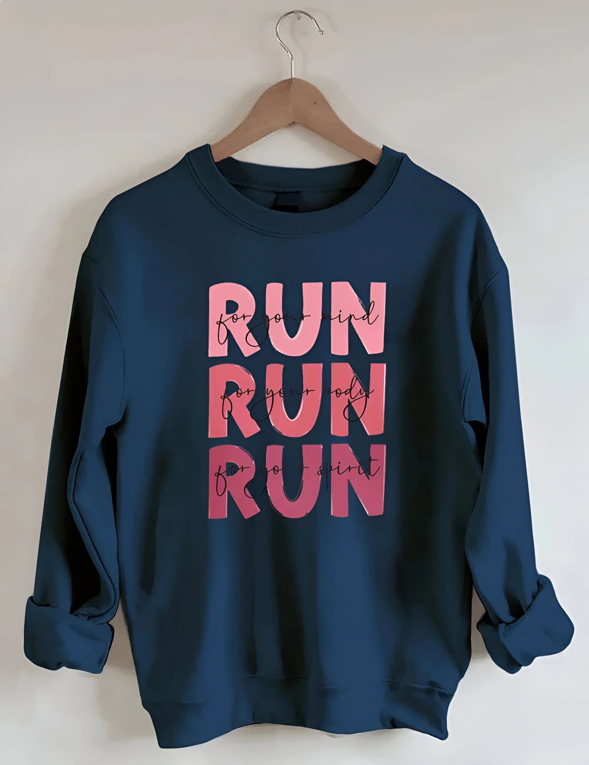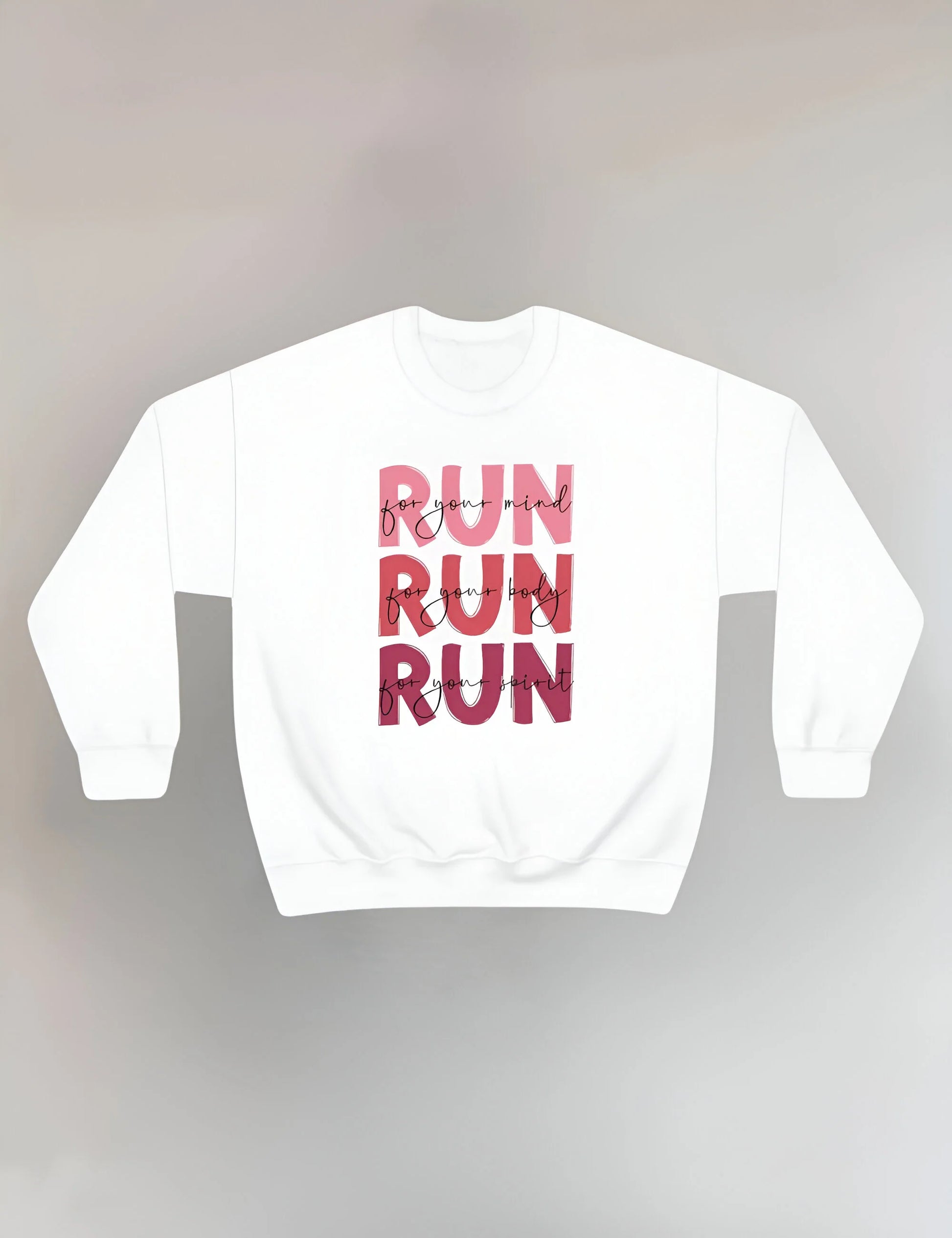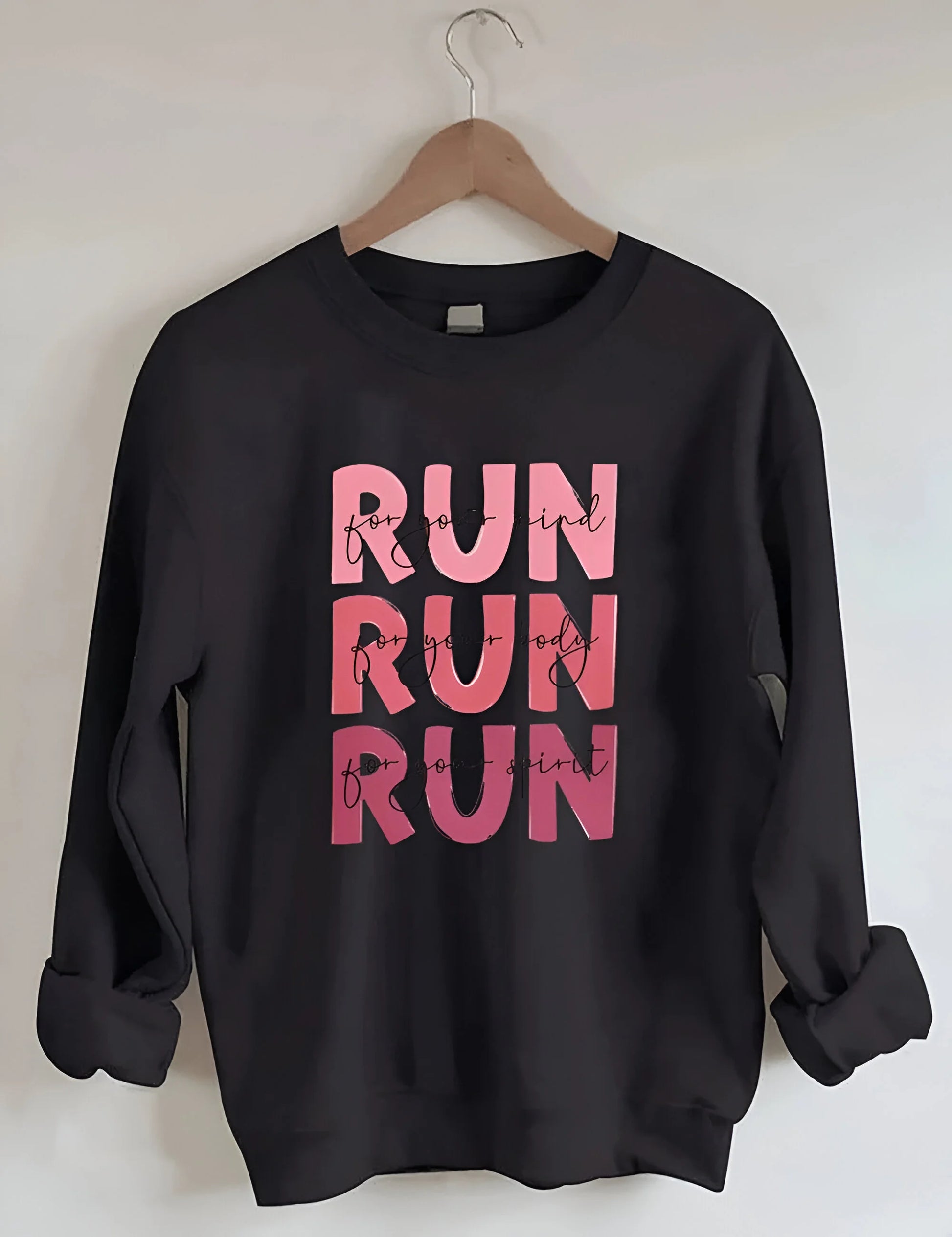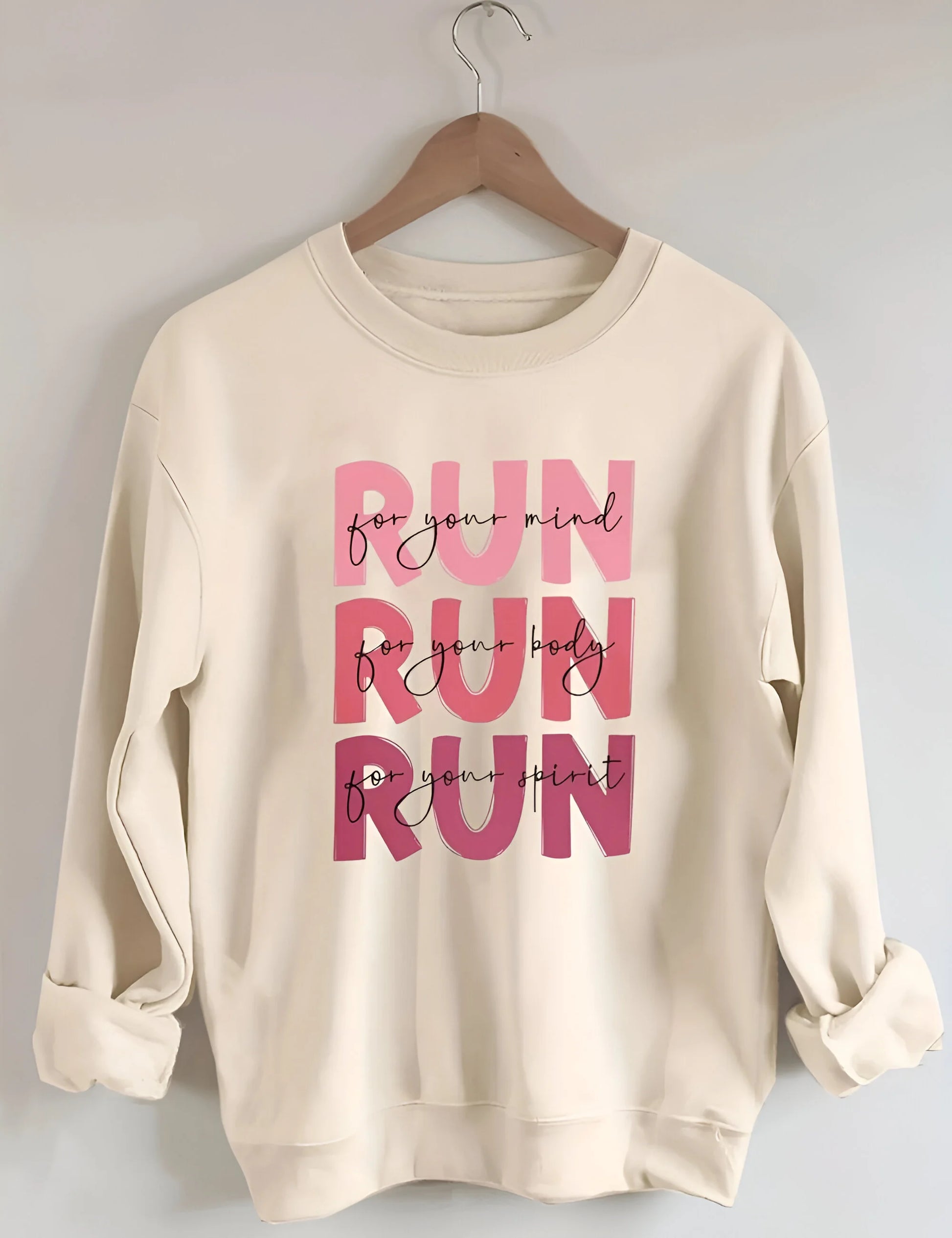 Zaprojektowana dla biegaczy na każdym poziomie, ta bluza z okrągłym dekoltem oferuje zarówno trwałość, jak i styl. Wykonana z wysokiej jakości mieszanki bawełny , zapewnia oddychający komfort, a wyrazisty nadruk z przodu przypomina, że ​​bieganie jest ważne dla umysłu, ciała i ducha.
