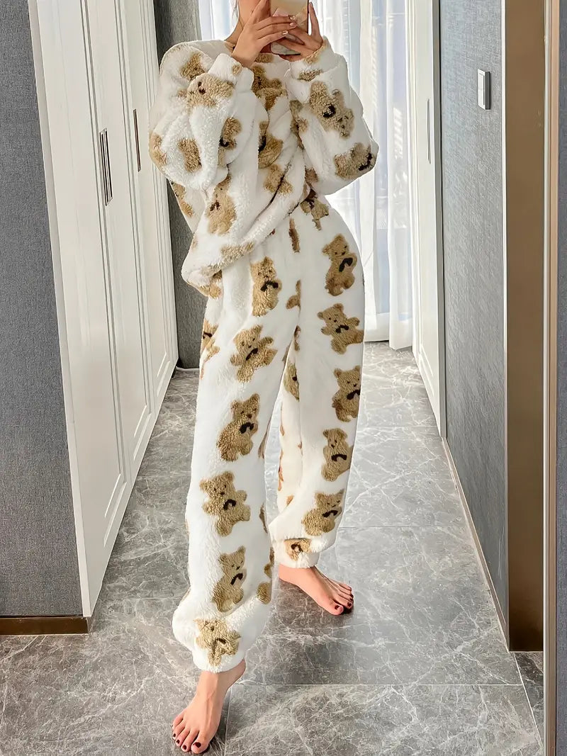Ten ciepły zestaw z misiem z motywem niedźwiedzia obejmuje bluzkę z długim rękawem, obniżonymi ramionami i okrągłym dekoltem, a także wygodne spodnie dresowe. Idealny na relaks lub nieformalne wyjścia, łączy w sobie zabawny design z maksymalnym komfortem na chłodniejsze dni.