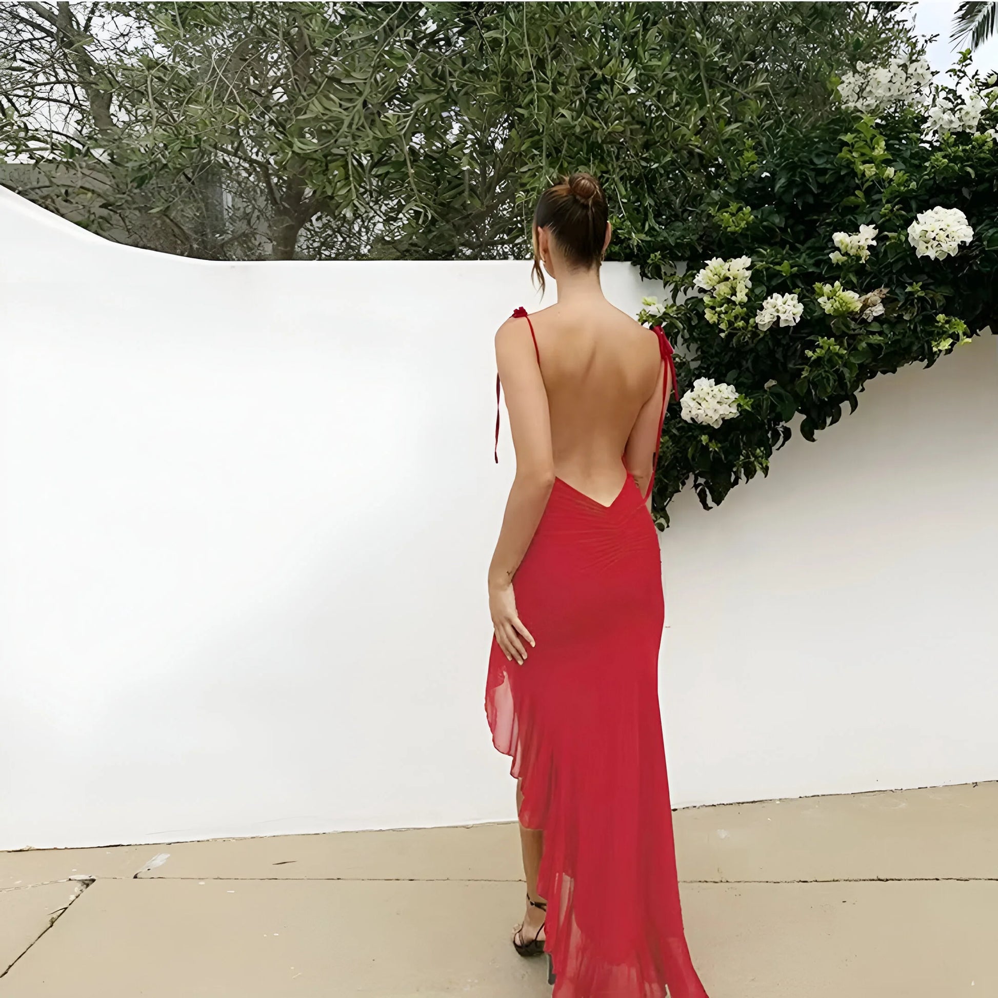 Przyciągnij uwagę tą oszałamiającą długą sukienką z wycięciem, odważnym rozcięciem do uda i delikatnymi wiązaniami na ramionach. Idealna na letnie wieczory lub wakacyjne wieczory, oferuje zarówno zmysłowy styl, jak i płynną elegancję.