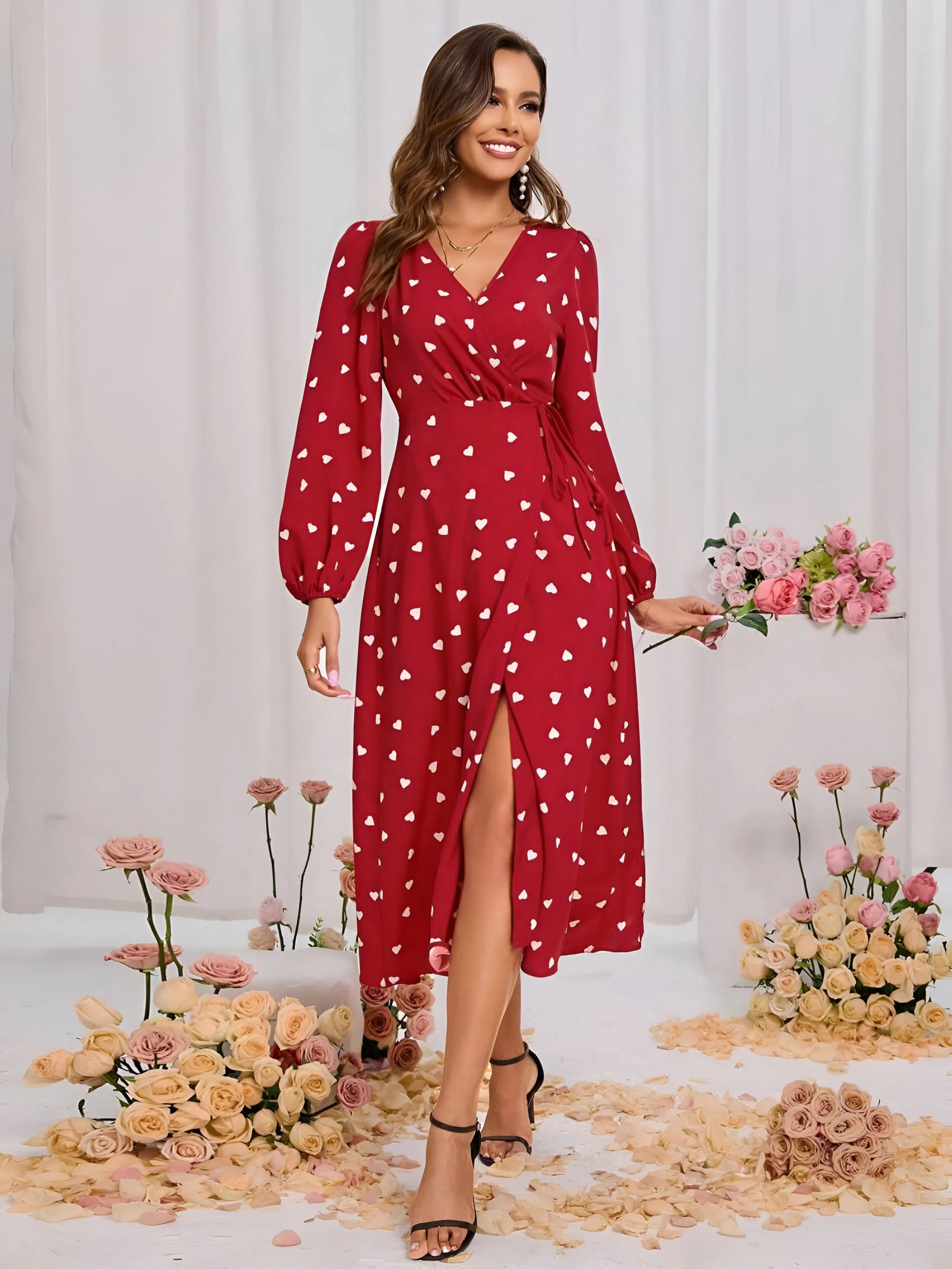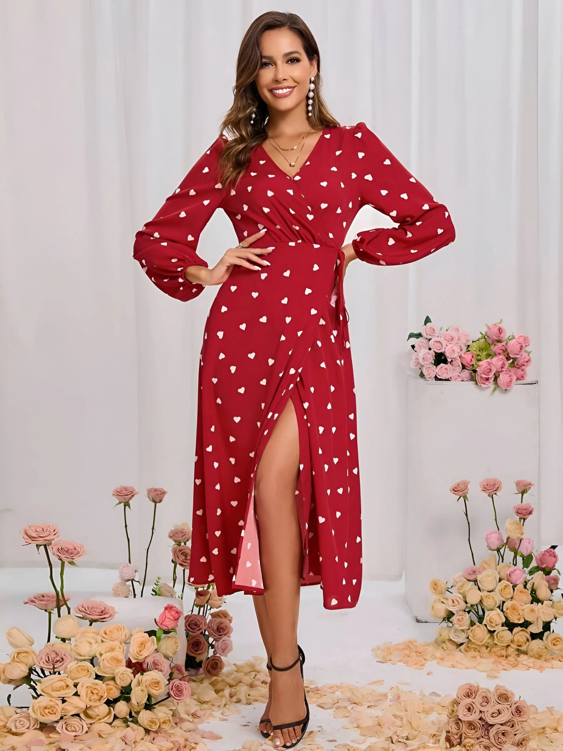 Postaw na czarującą elegancję dzięki tej sukience kopertowej z nadrukiem w serca zaprojektowanej dla zwiewnej elegancji. Jej pochlebna sylwetka i zabawne rozcięcie sprawiają, że jest to wyróżniający się element na brunche, randki lub przyjęcia ogrodowe.