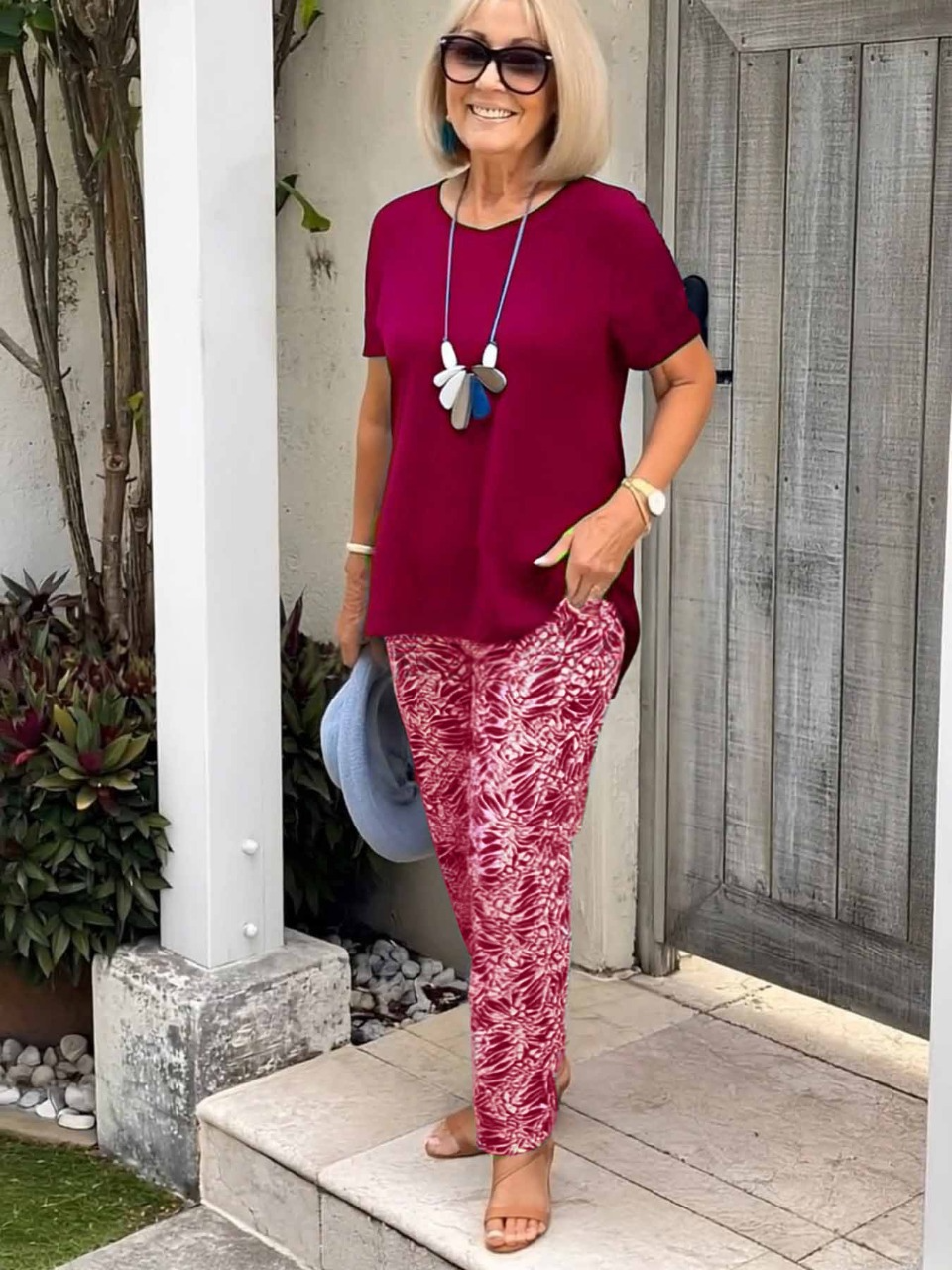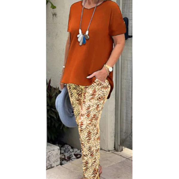 Wszechstronny i stylowy:Ten dwuczęściowy zestaw jest nie tylko praktyczny, ale i stylowy. Jednolity top w połączeniu ze wzorzystymi spodniami tworzy szykowny i nowoczesny wygląd, który można nosić zarówno na co dzień, jak i na elegancko.
