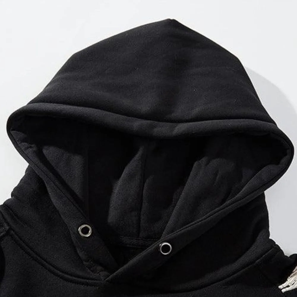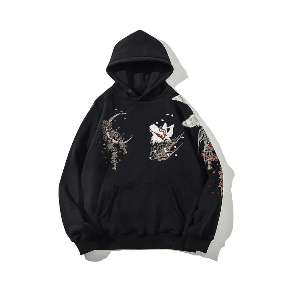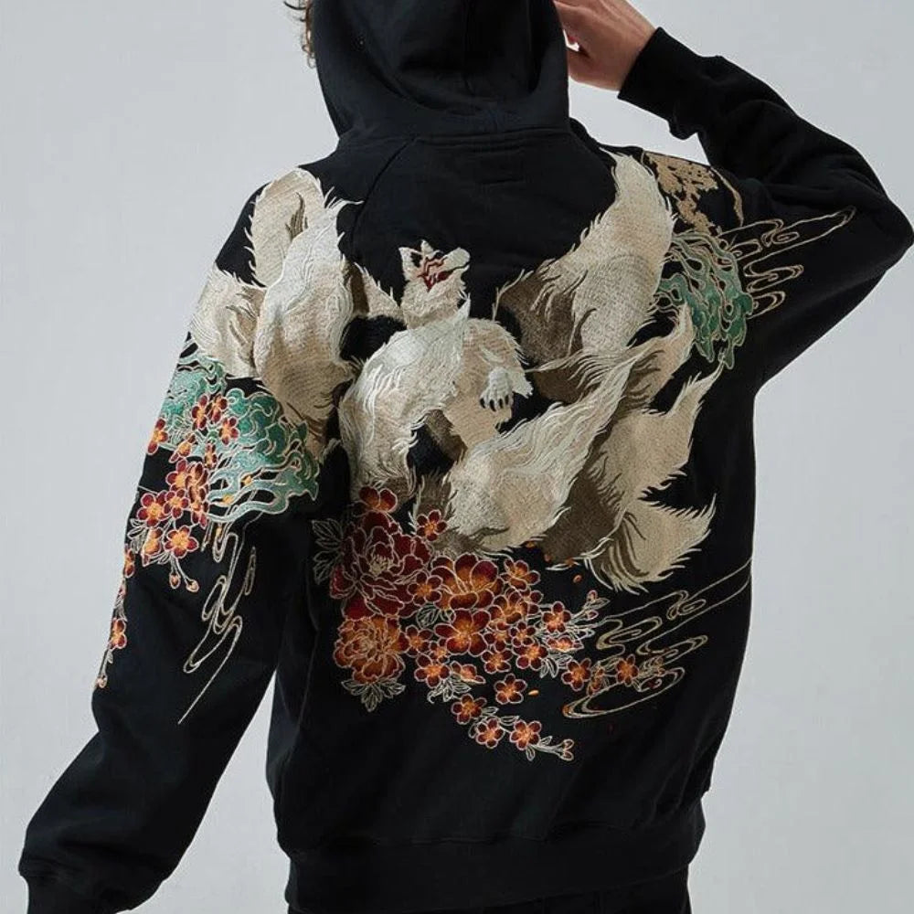 Ta męska bluza z kapturem w stylu vintage ma misterny haft z dziewięcioma ogonami lisa inspirowany japońskim folklorem. Wykonana z miękkiej bawełny z wykończeniem w formie ściągacza, prezentuje półksiężyc i wzór lisa na piersi, podczas gdy plecy i rękawy prezentują kolorowe elementy kwiatowe, wiatrowe i wodne. Niepowtarzalny element symbolizujący szczęście i ponadczasowy styl.