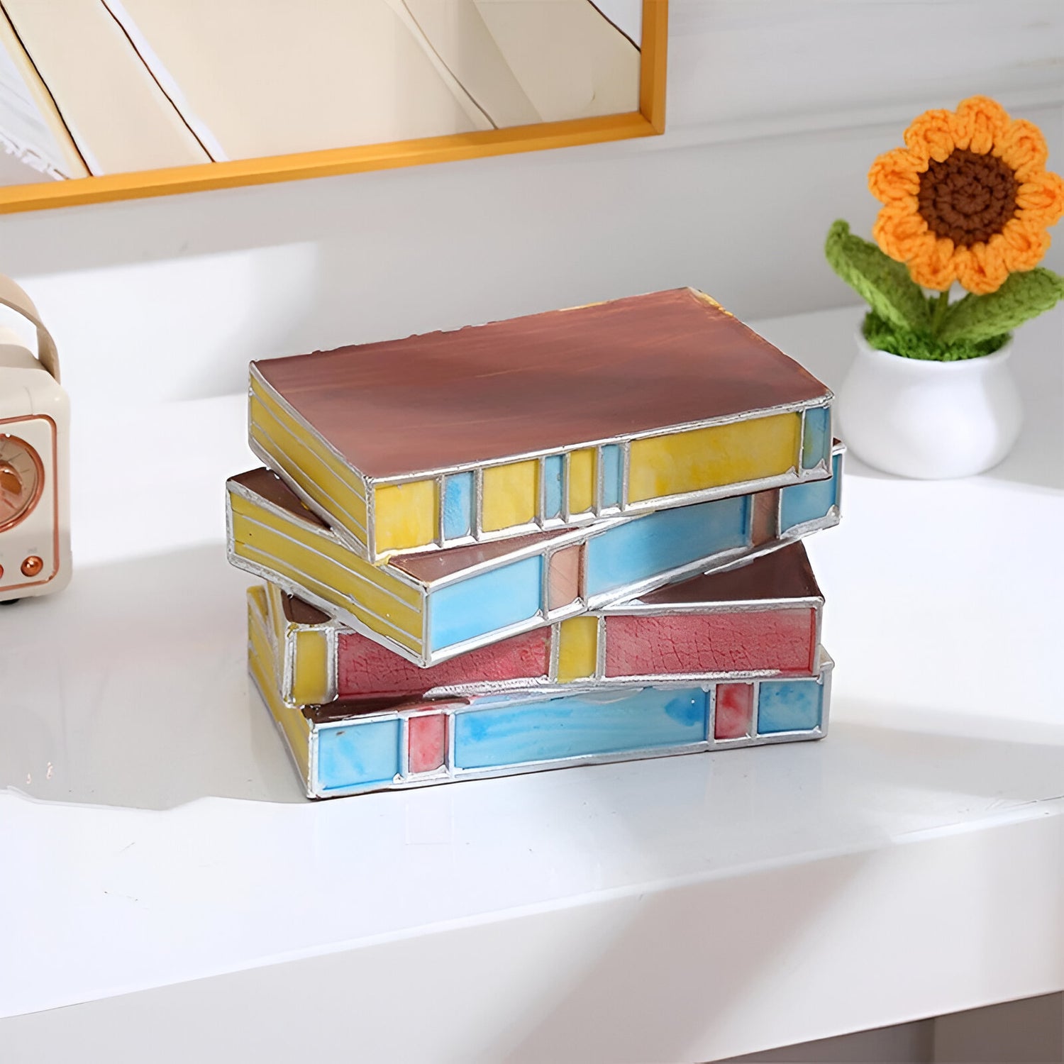 Lampa z żywicy „Stos książek” dodaje przytulnego, książkowego charakteru każdemu pomieszczeniu. Zaprojektowana tak, aby przypominała mały stos klasycznych powieści, wprowadza ciepło i nostalgię do sypialni, kąta czytelniczego lub biurka. Panele w stylu witraży świecą miękkimi bursztynowymi, czerwonymi i zielonymi odcieniami, tworząc spokojne i przytulne światło, idealne na ciche wieczory.