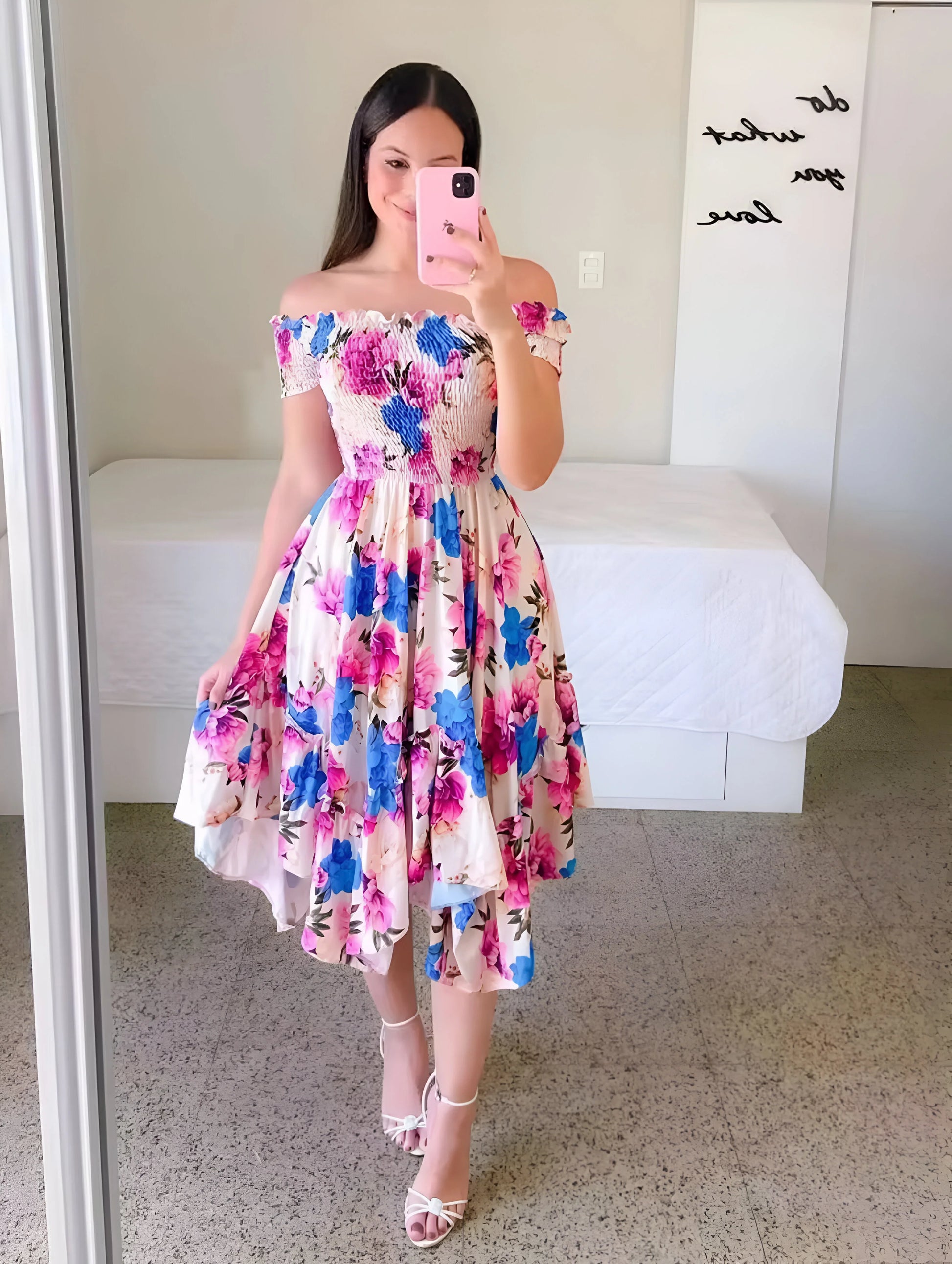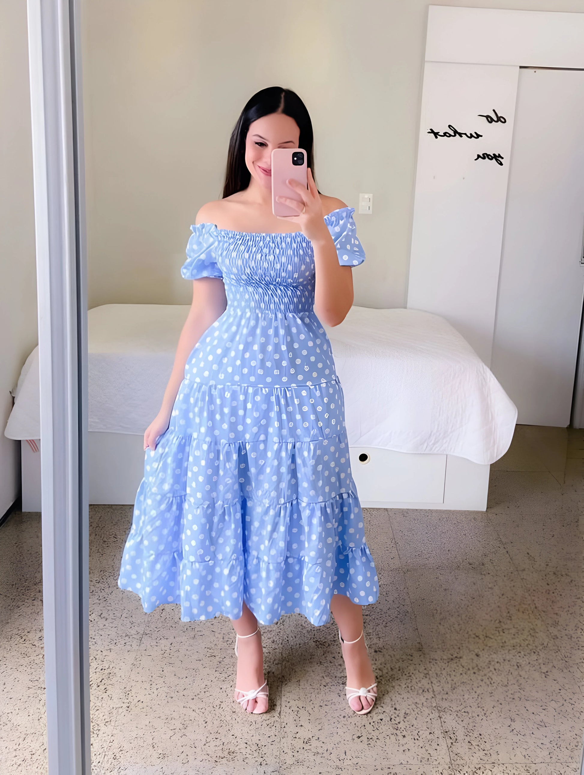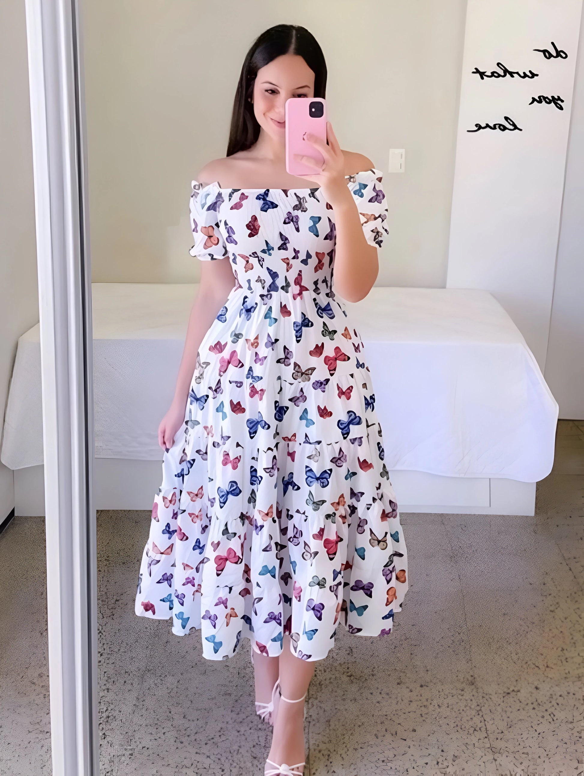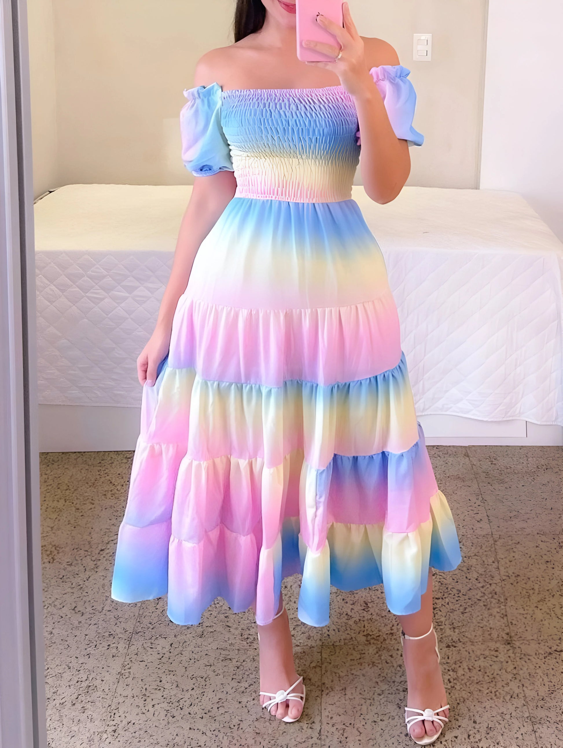 Urocza i figlarna, ta warstwowa sukienka midi ma marszczony gorset i miękkie bufiaste rękawy, co zapewnia pochlebny, kobiecy wygląd. Dostępna w wielu żywych kolorach i wzorach na każdą słoneczną wycieczkę.
