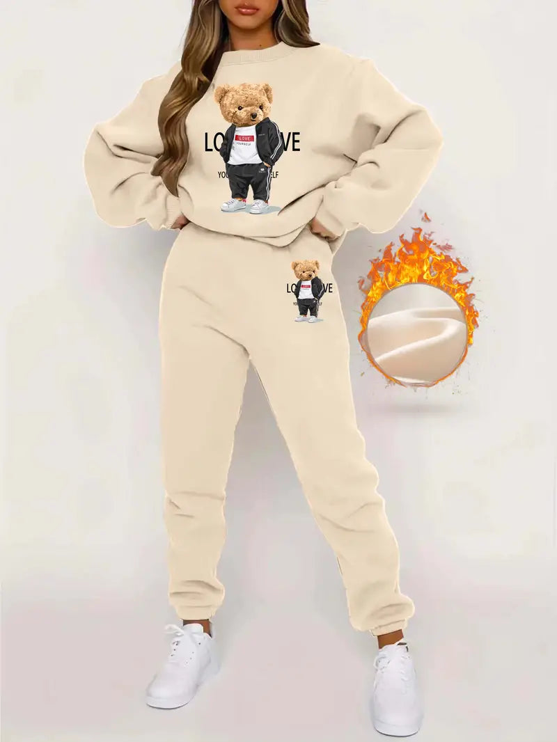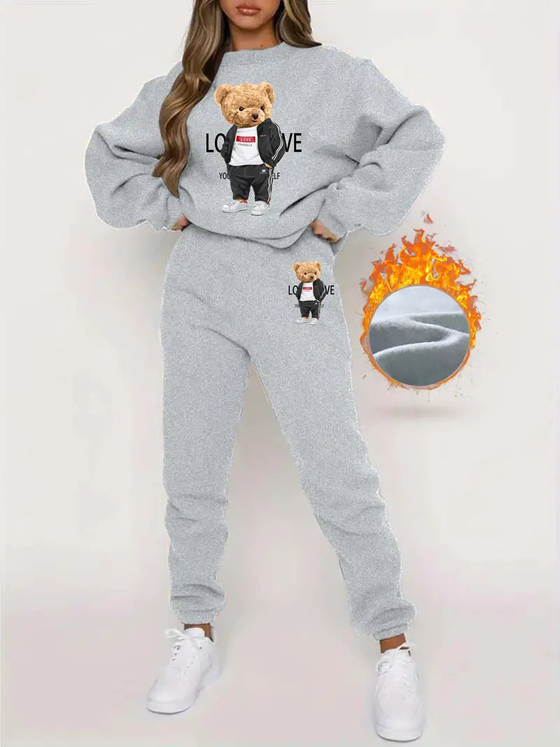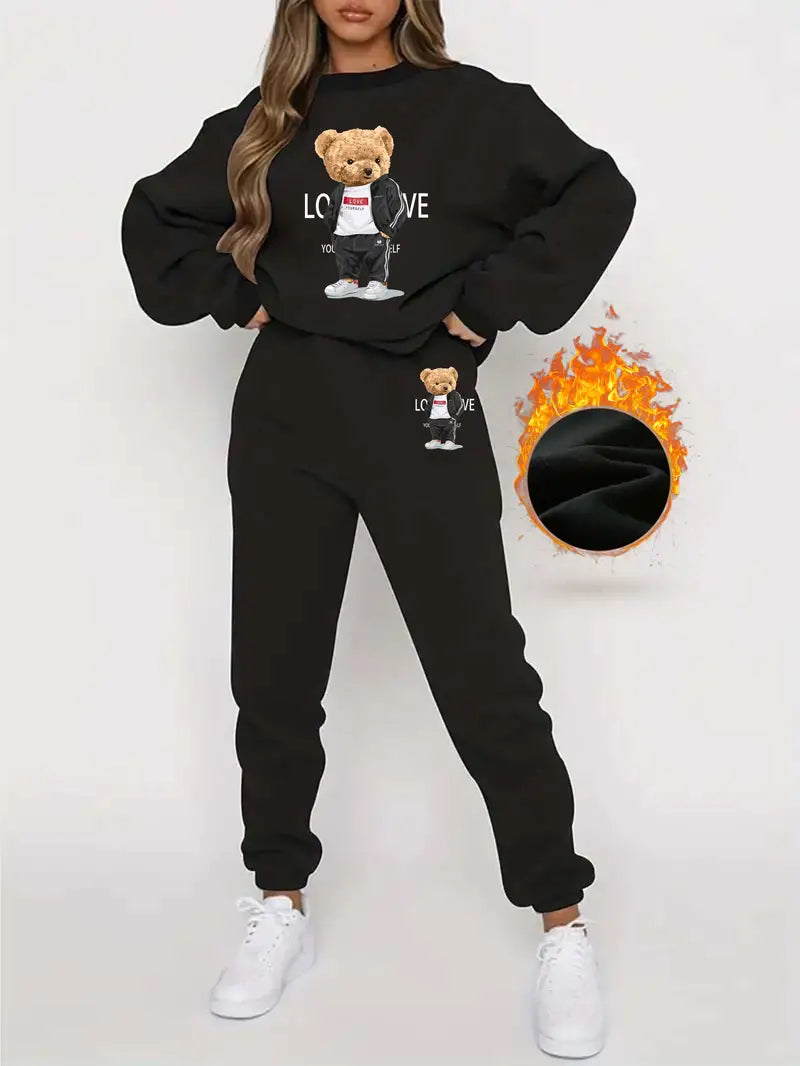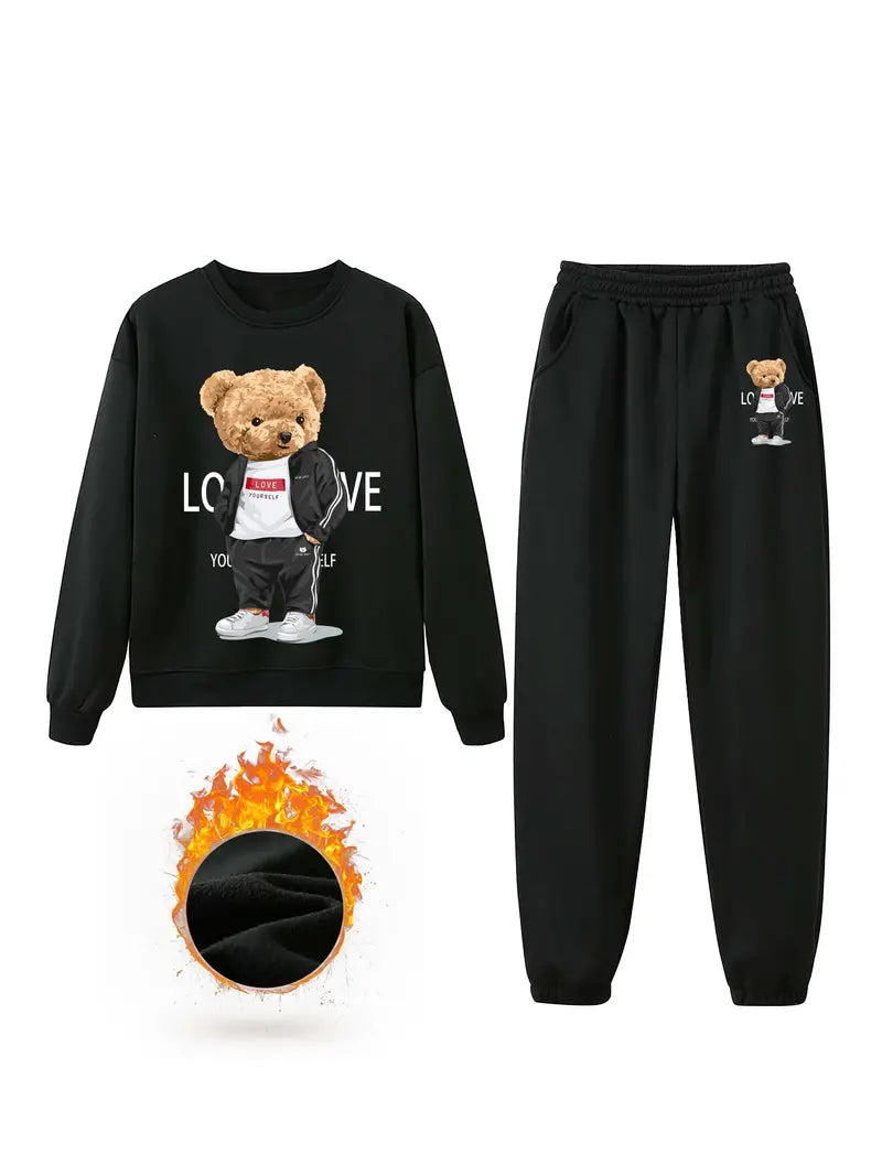 Szukasz przytulnego stylu? Ten zestaw z nadrukiem niedźwiedzia, składający się z bluzy z długim rękawem i spodni dresowych, zapewni Ci ciepło i uroczo przez cały dzień. Zamów teraz!