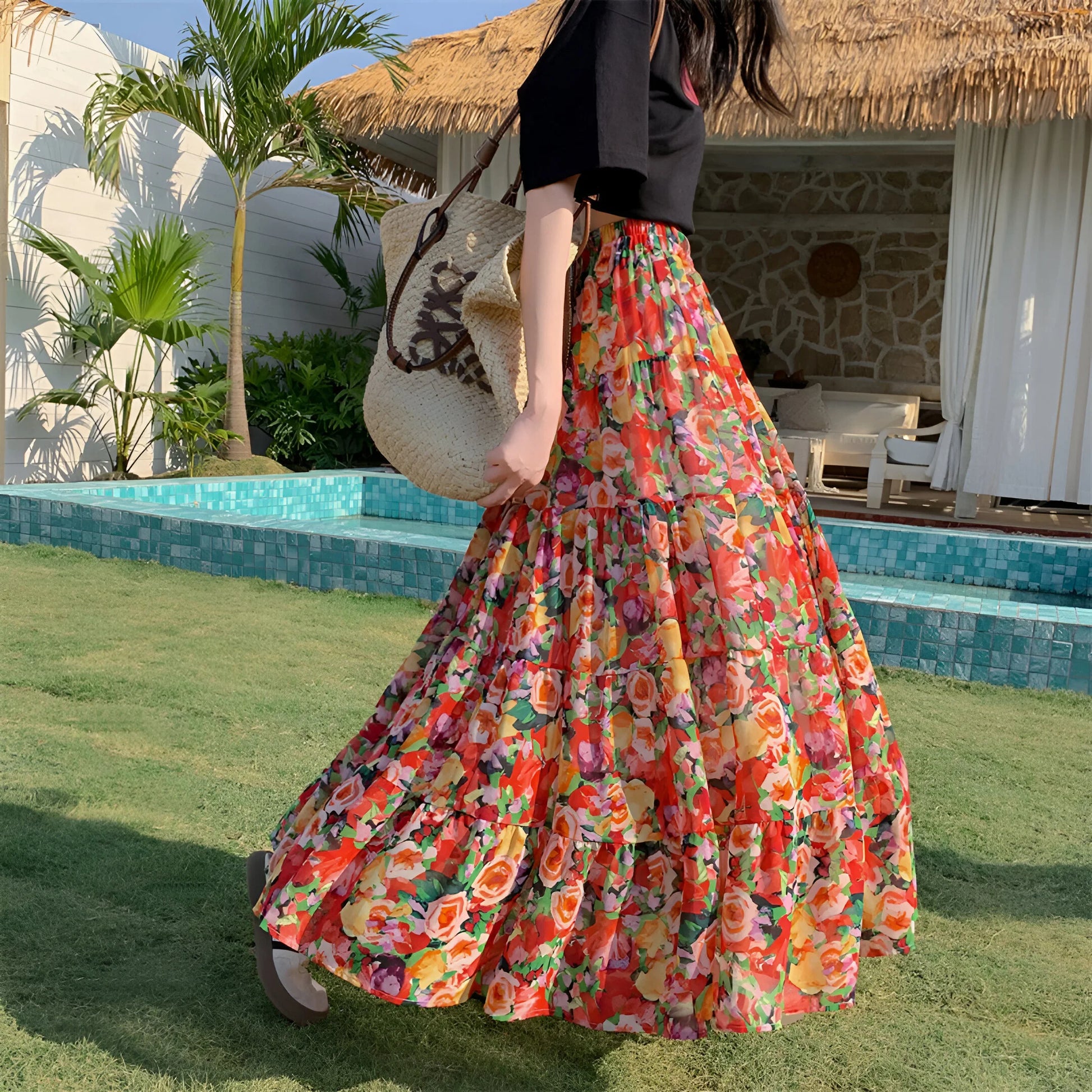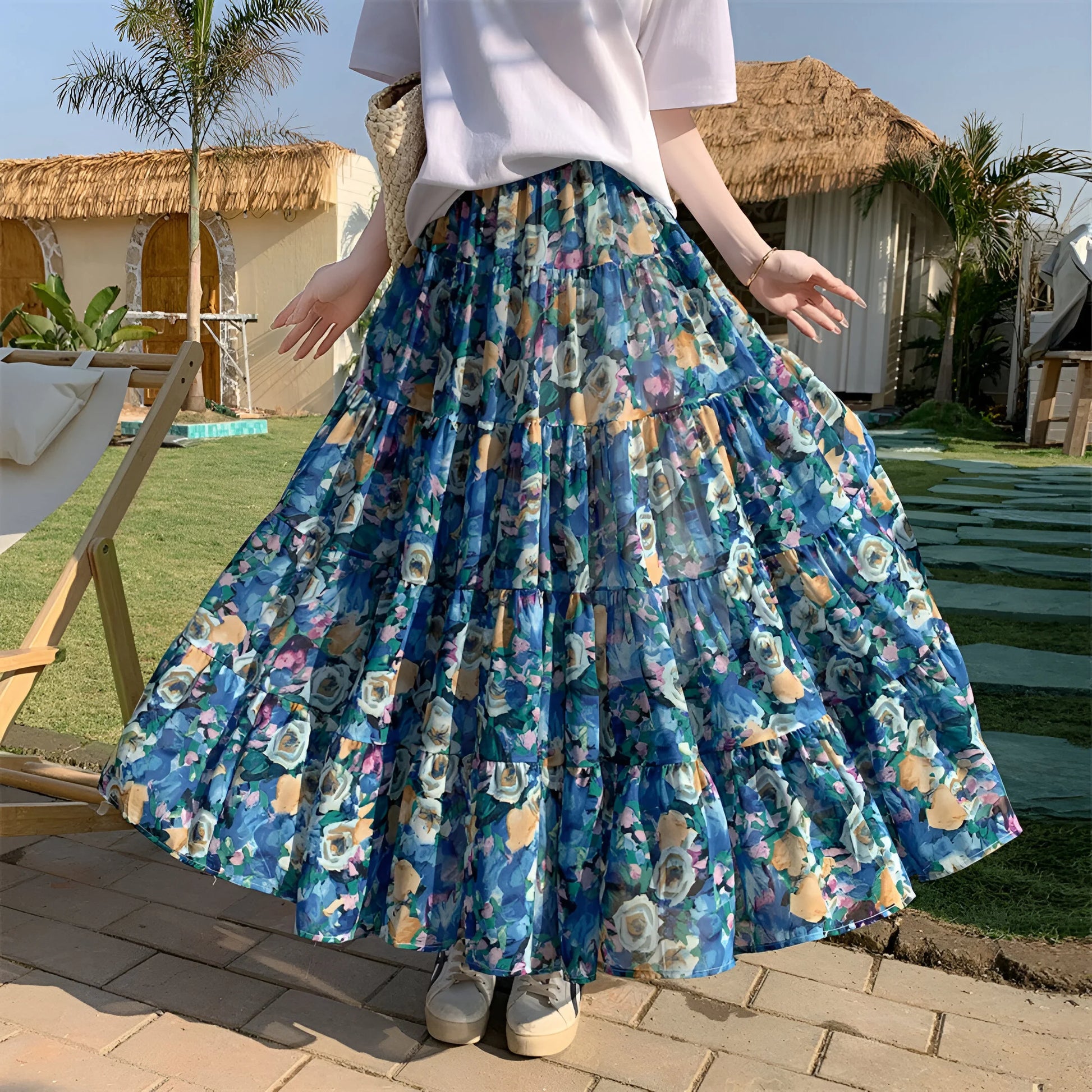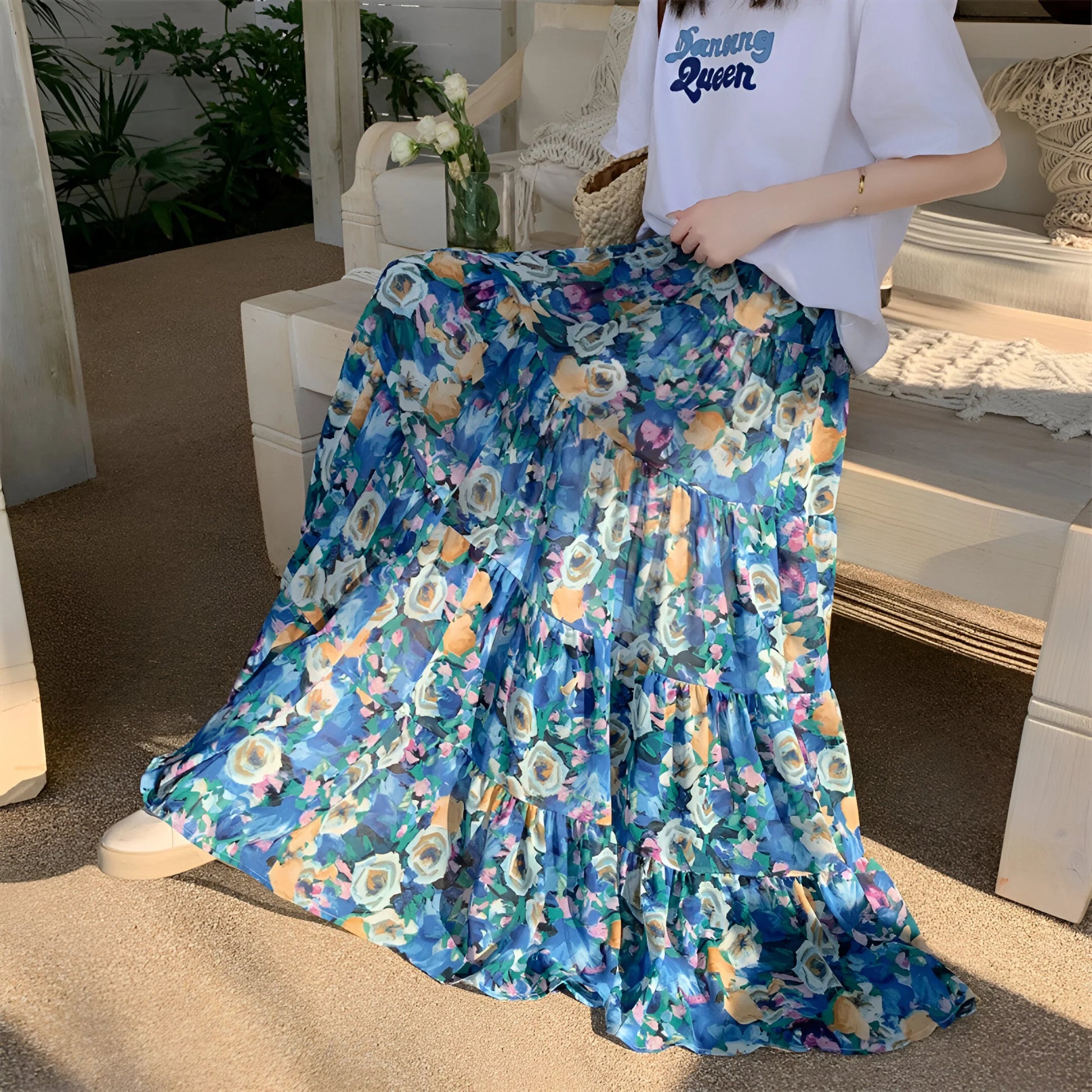 Daj się porwać wolnemu duchowi lata z naszą Elegancką Kwiecistą Spódnicą Boho, żywym hołdem dla kobiecości i wygody. Wykonana z płynnej, lekkiej tkaniny, tańczy z każdym Twoim krokiem i podkreśla każdą sylwetkę.