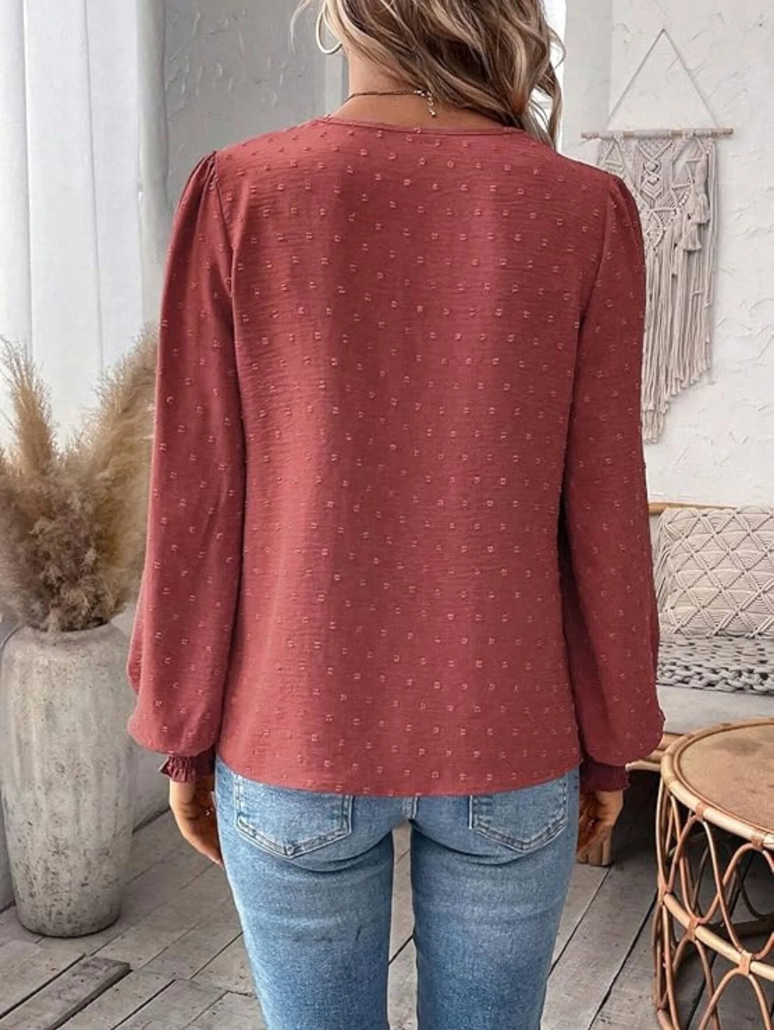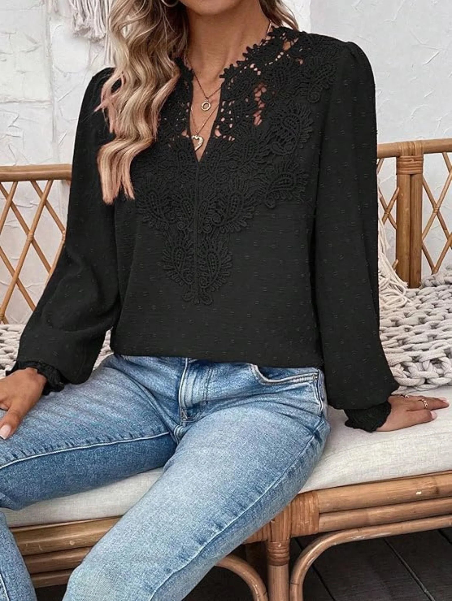 Ta pięknie wykonana koronkowa bluzka łączy ponadczasową elegancję z nowoczesną wyrafinowaną elegancją. Z delikatnym dekoltem w serek i eleganckimi długimi rękawami, idealnie nadaje się do biura, na spotkania biznesowe lub na wieczorne wyjście, zapewniając jednocześnie całodzienny komfort.