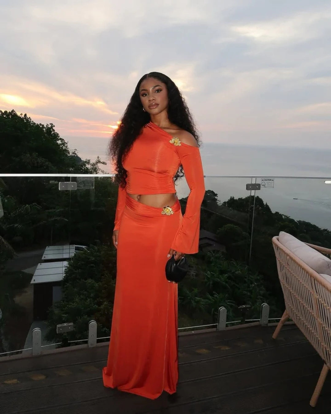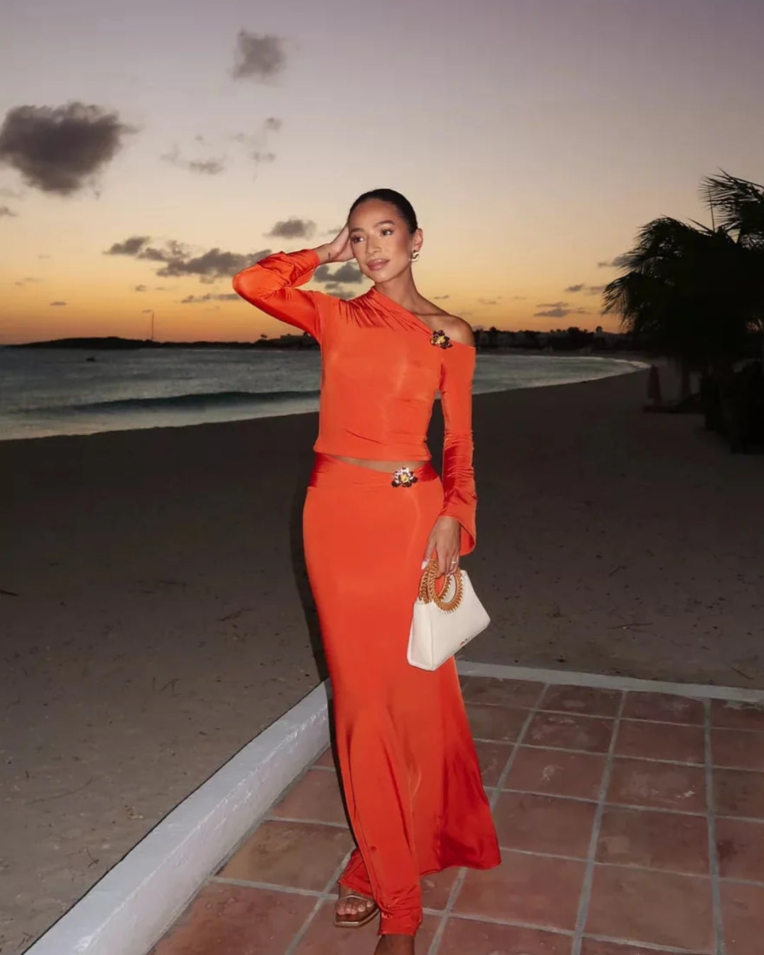 Podnieś swój wieczorowy styl dzięki dwuczęściowemu kompletowi Séraphine, zaprojektowanemu z asymetryczną górą i zwiewną spódnicą ozdobioną kwiatowymi zdobieniami. Wykonany z wysoce elastycznej tkaniny, oferuje pochlebną i pełną wdzięku sylwetkę na każdą wyrafinowaną okazję.