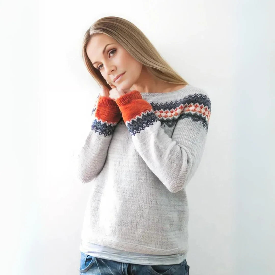 Szukasz przytulnego swetra na chłodne dni? Sweter Sigrun z zimowym wzorem to idealny wybór. Miękki, wygodny i stylowy, świetny na zimowe dni.