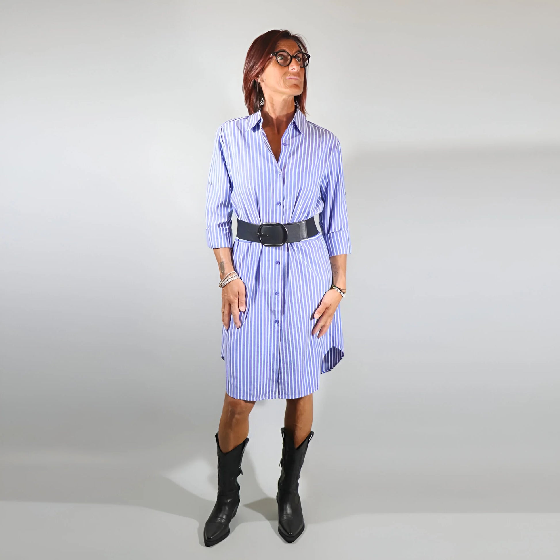 Klasyka spotyka się z nowoczesnością w tej koszulowej sukience w paski z usztywnionym kołnierzem i paskiem w talii. Idealna na swobodną elegancję, bez wysiłku przechodzi z dnia roboczego do weekendu.