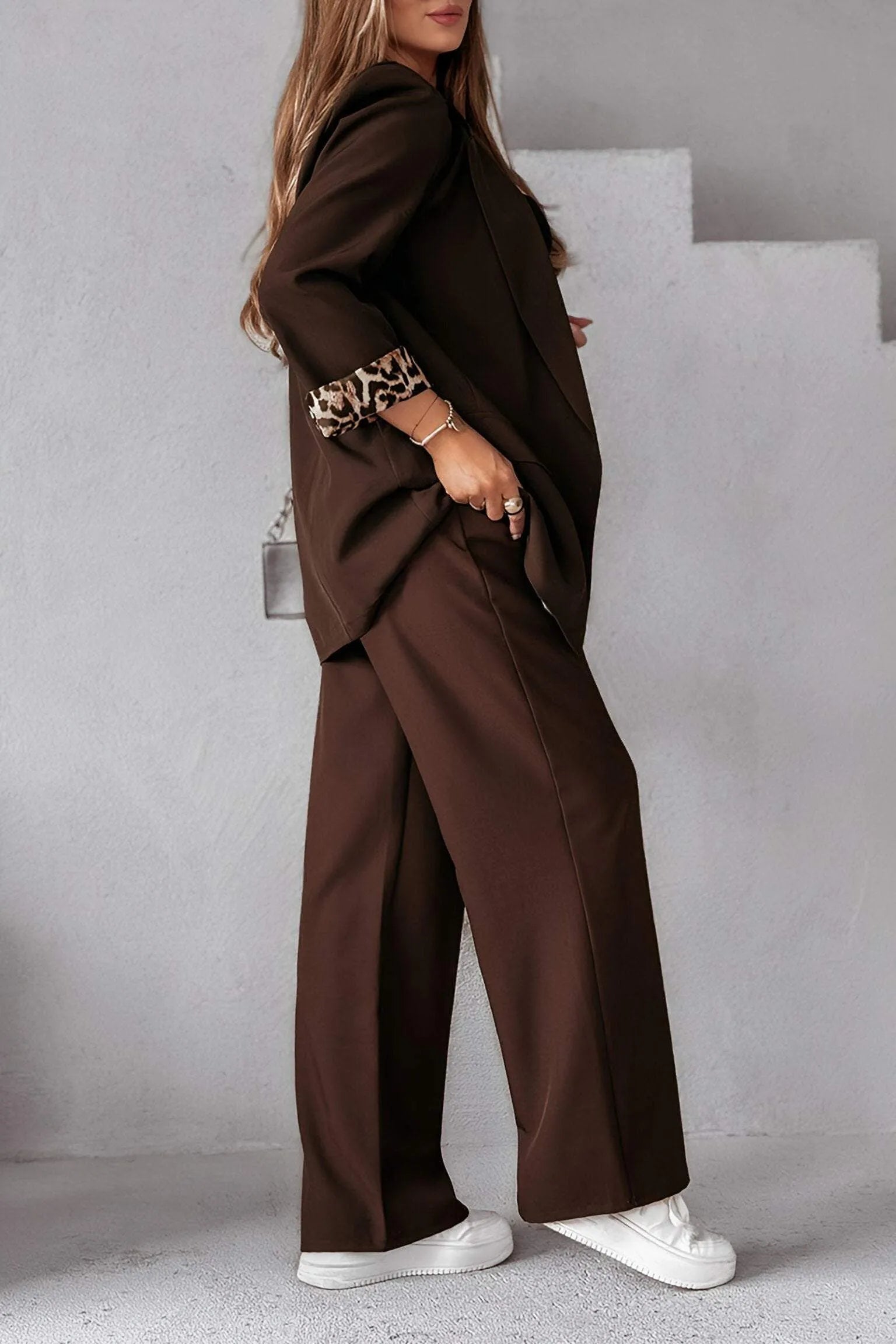 Podszewka z nadrukiem w panterkę na mankietach wprowadza nieoczekiwany zwrot akcji do tego ponadczasowego zestawu. Niezależnie od tego, czy ubrana w obcasy na wieczorne wyjście, czy w połączeniu ze sneakersami, aby uzyskać swobodny, ale elegancki wygląd, ten zestaw na nowo definiuje wszechstronność z nutą odważnego glamour.