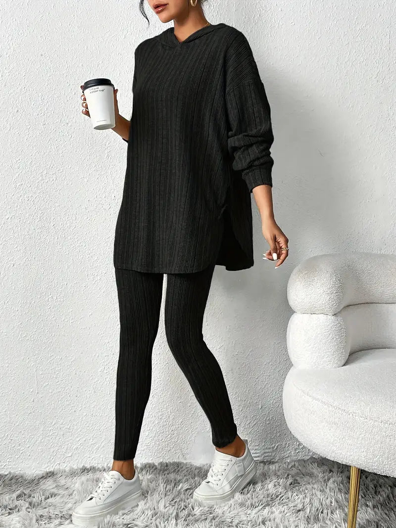 Szukasz swobodnego stylu? Ten prążkowany dwuczęściowy zestaw składa się z bluzy z kapturem i dopasowanych spodni, łącząc wygodę z eleganckim wyglądem. Idealny na co dzień — kup teraz!