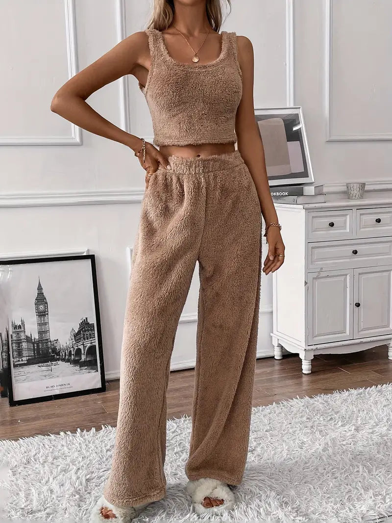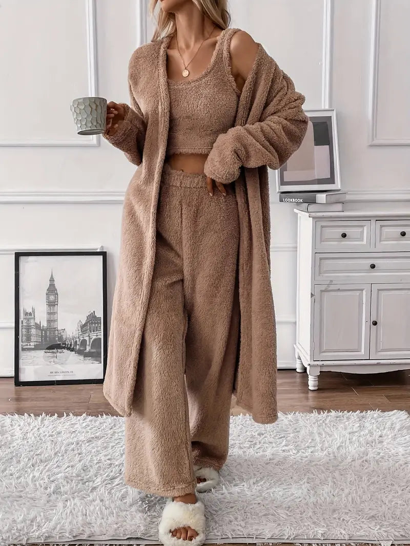 Szukasz ciepłego i stylowego stroju na zimę? Ten 3-częściowy zestaw zawiera dzianinową kamizelkę, pluszowy płaszcz z długim rękawem i luźne spodnie, zapewniając ciepło i elegancję dzięki szalowemu kołnierzowi.