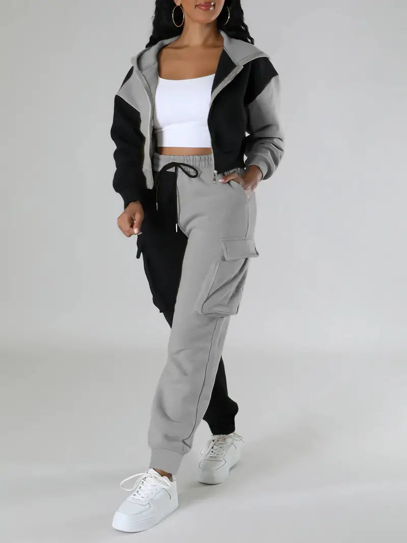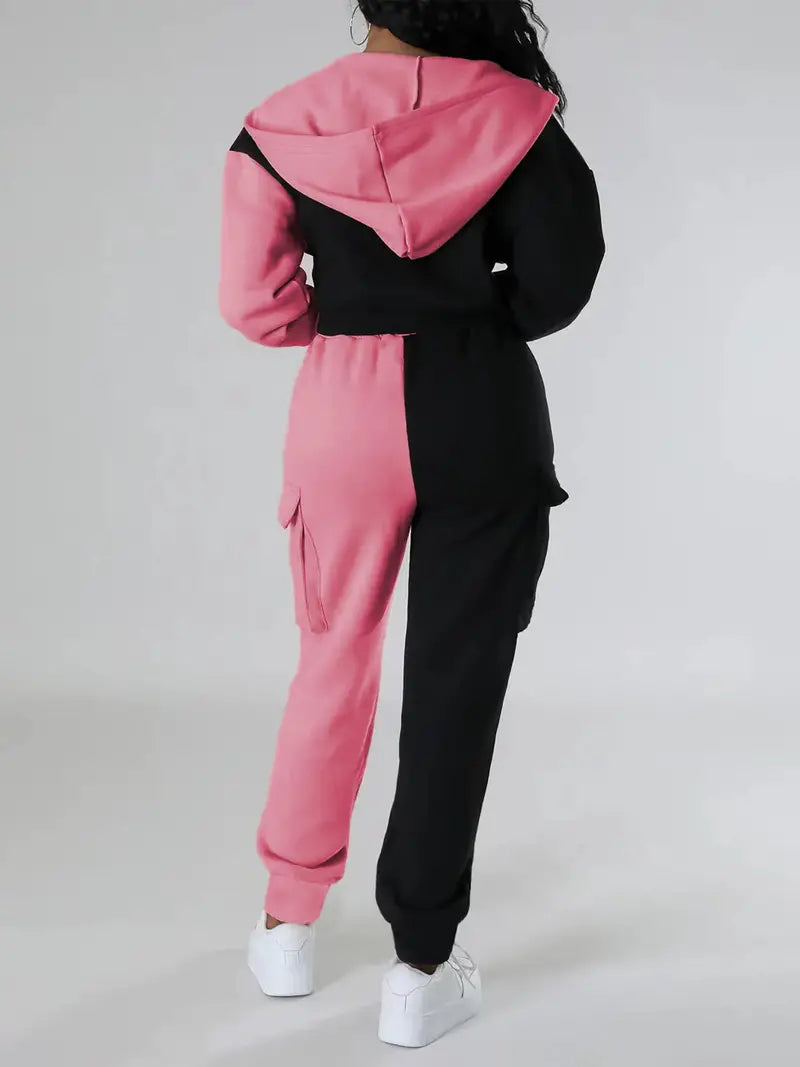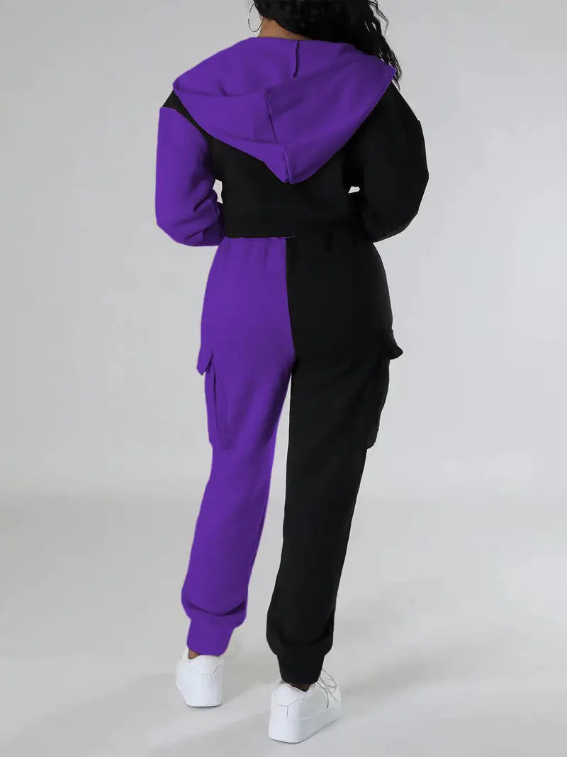 Podnieś poziom swojej swobodnej garderoby dzięki temu zestawowi w bloki kolorów. Ten strój, składający się z bluzy z kapturem z kołnierzem i dopasowanych spodni z elastycznym pasem i kieszeniami z klapkami, łączy wygodę i styl. Idealny na dni relaksu i codzienne wyjścia.