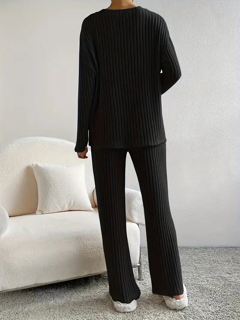 Zachowaj styl i wygodę! Ten swobodny prążkowany zestaw składa się z długiego topu z dekoltem w serek i luźnych spodni — idealny na dni relaksu. Kup teraz!