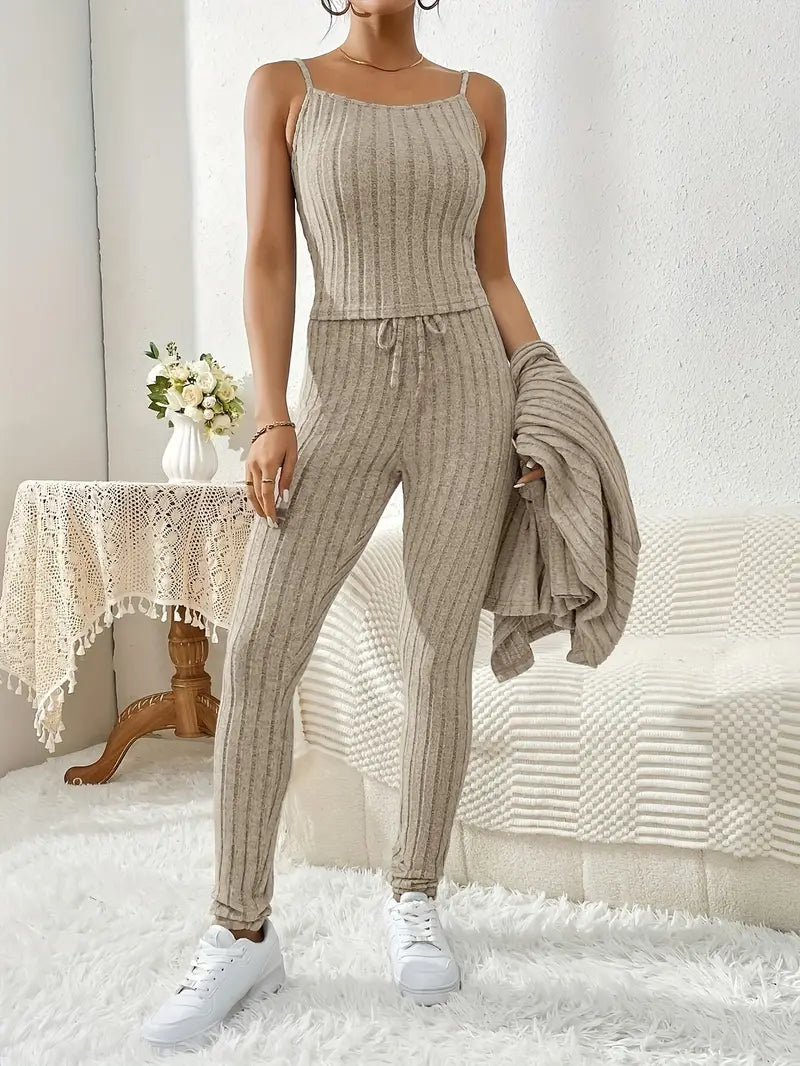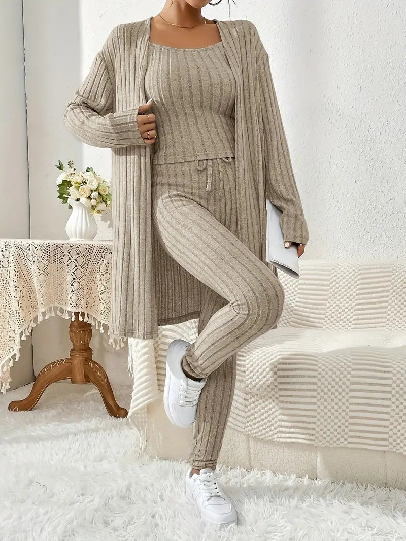 Ten elegancki trzyczęściowy zestaw zawiera teksturowany, długi, otwarty kardigan, dopasowany top i spodnie z elastycznym pasem. To idealne połączenie wygody i stylu na każdą okazję, zarówno swobodną, ​​jak i półformalną.